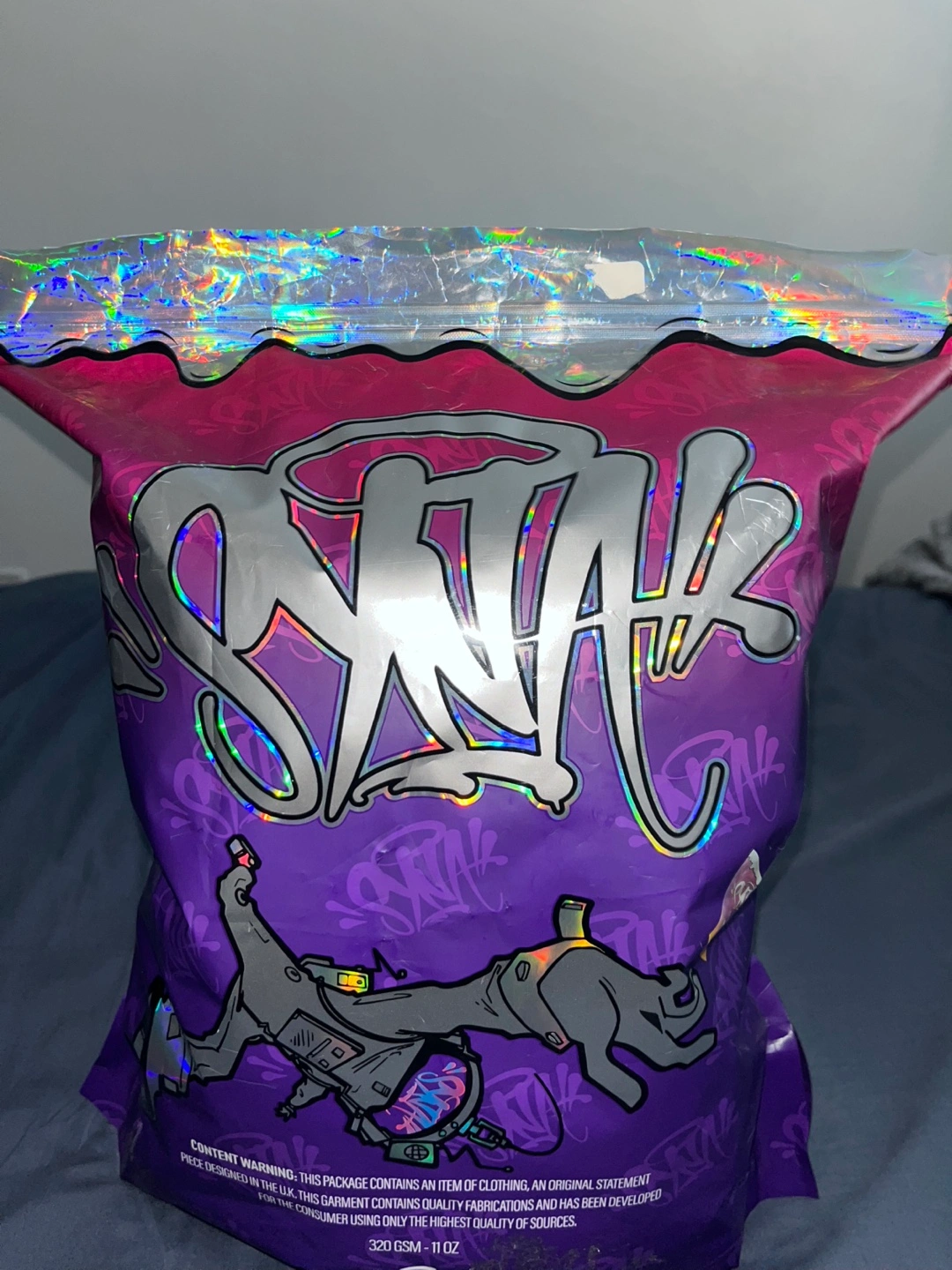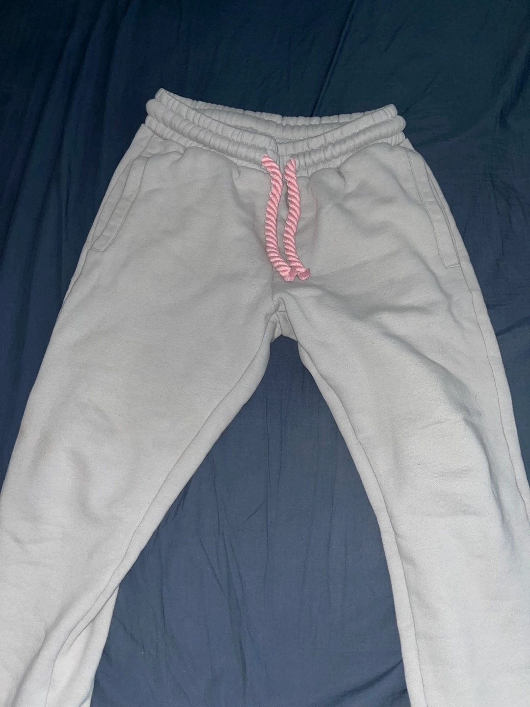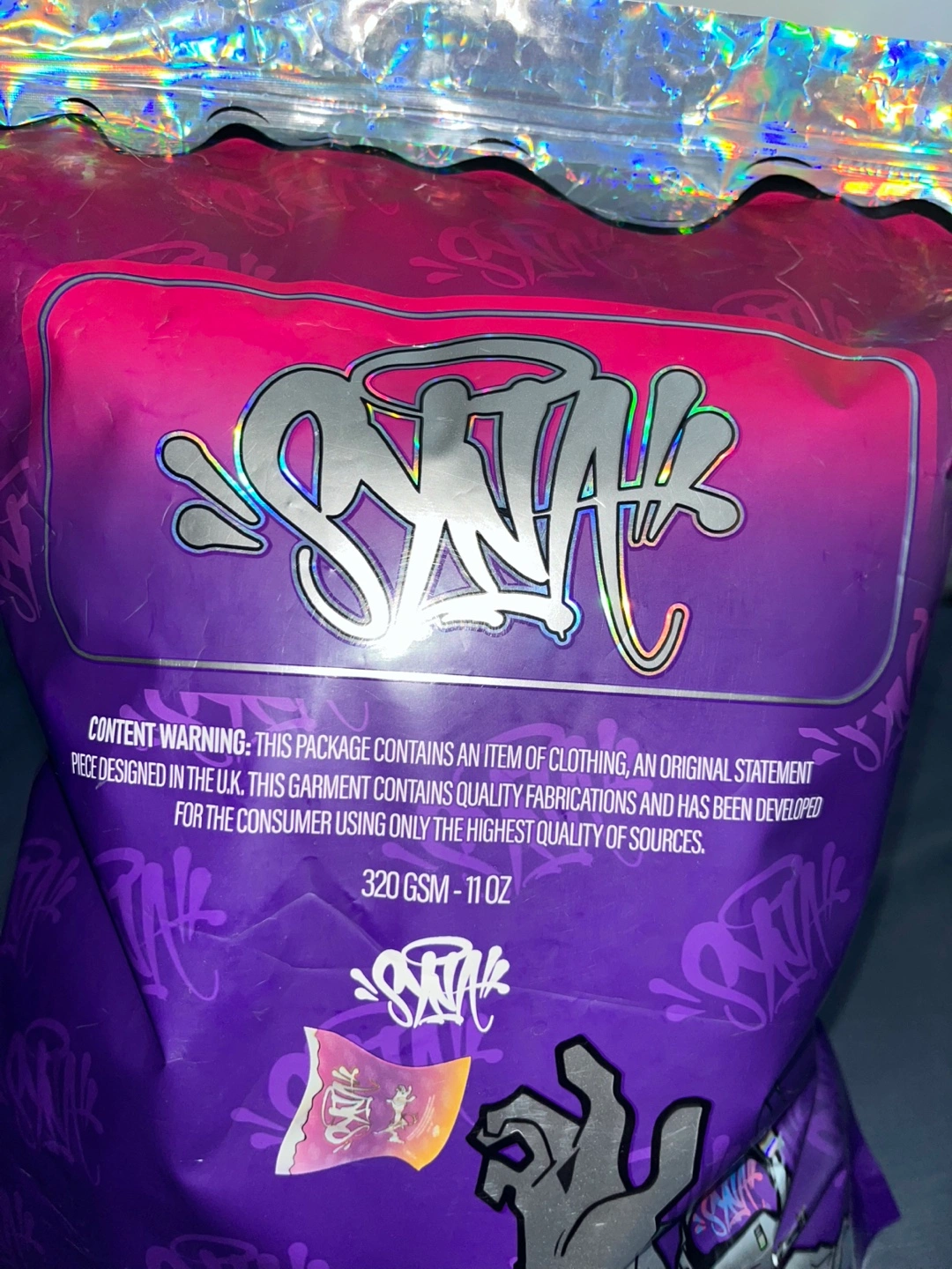 Light grey joggers and Hoodie. Pink drawstrings and embroidered detail. SYNA WORLD branding on back of the joggers and Front of the hood on hoodie. Includes stickers in the bag too.