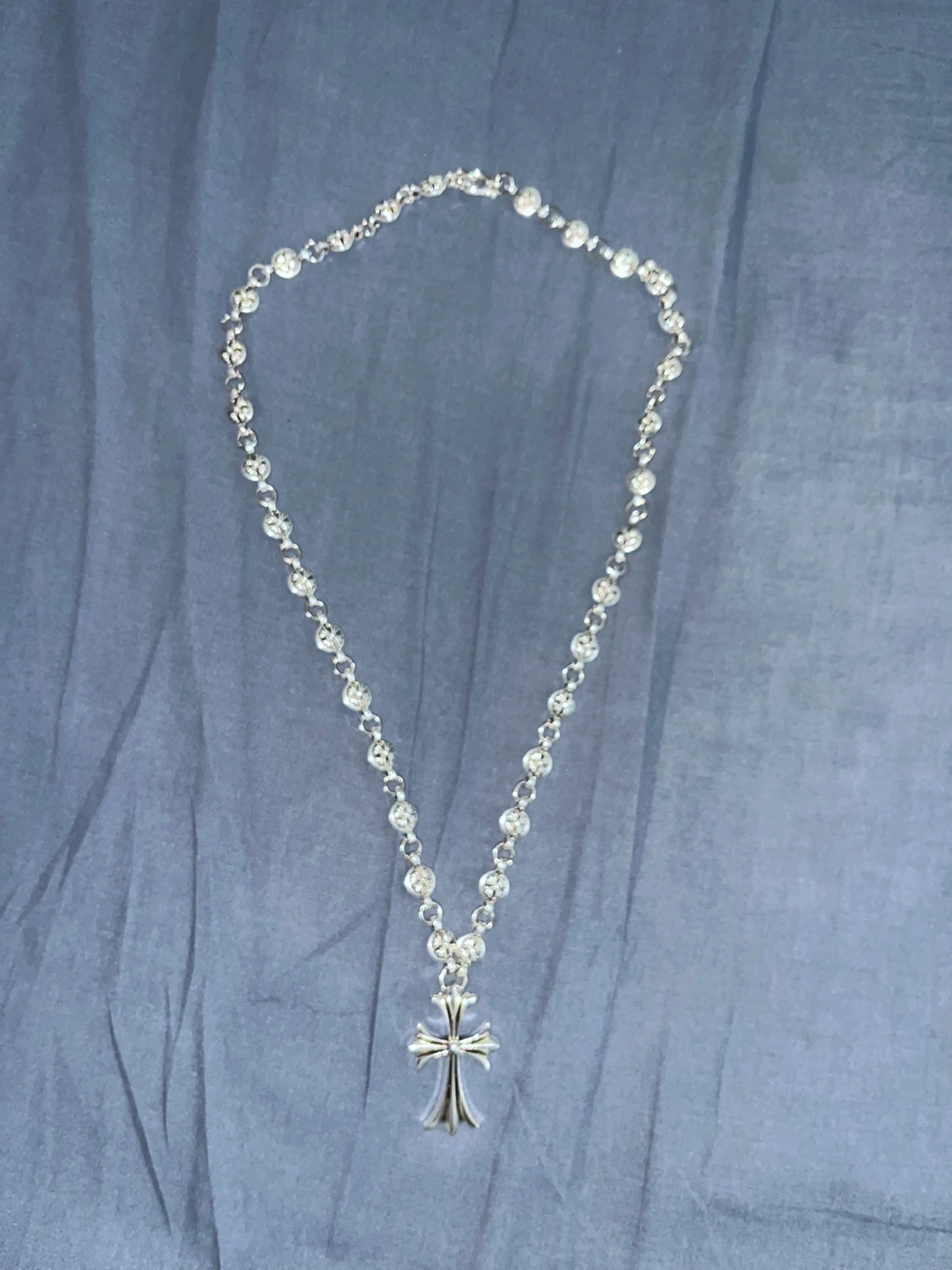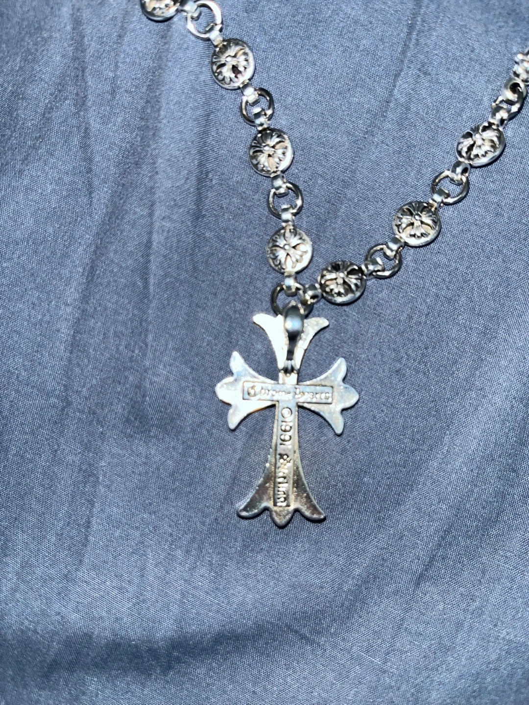 Silver necklace features a detailed cross pendant. Chain adorned with floral accents. Clasp closure. Stylish and eye-catching.