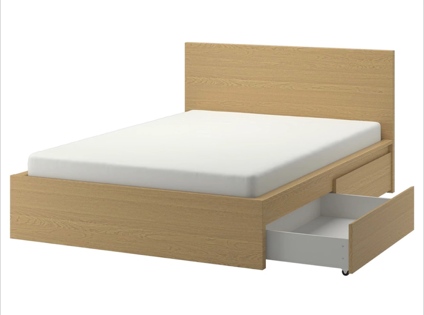 Double bed frame, light oak finish. Includes 4 large drawers for storage. 1 drawer is messing 2 wheels (available to buy in Ikea). Good conditions. Doesn't include the mattress.