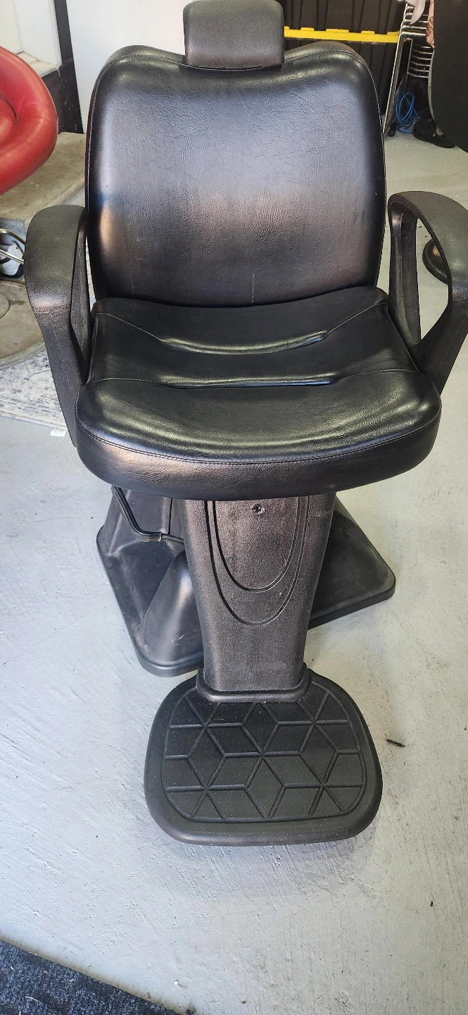 Used barber chair, black vinyl. Hydraulic lift. Includes headrest and armrests. Good condition. Perfect for a barbershop or salon.