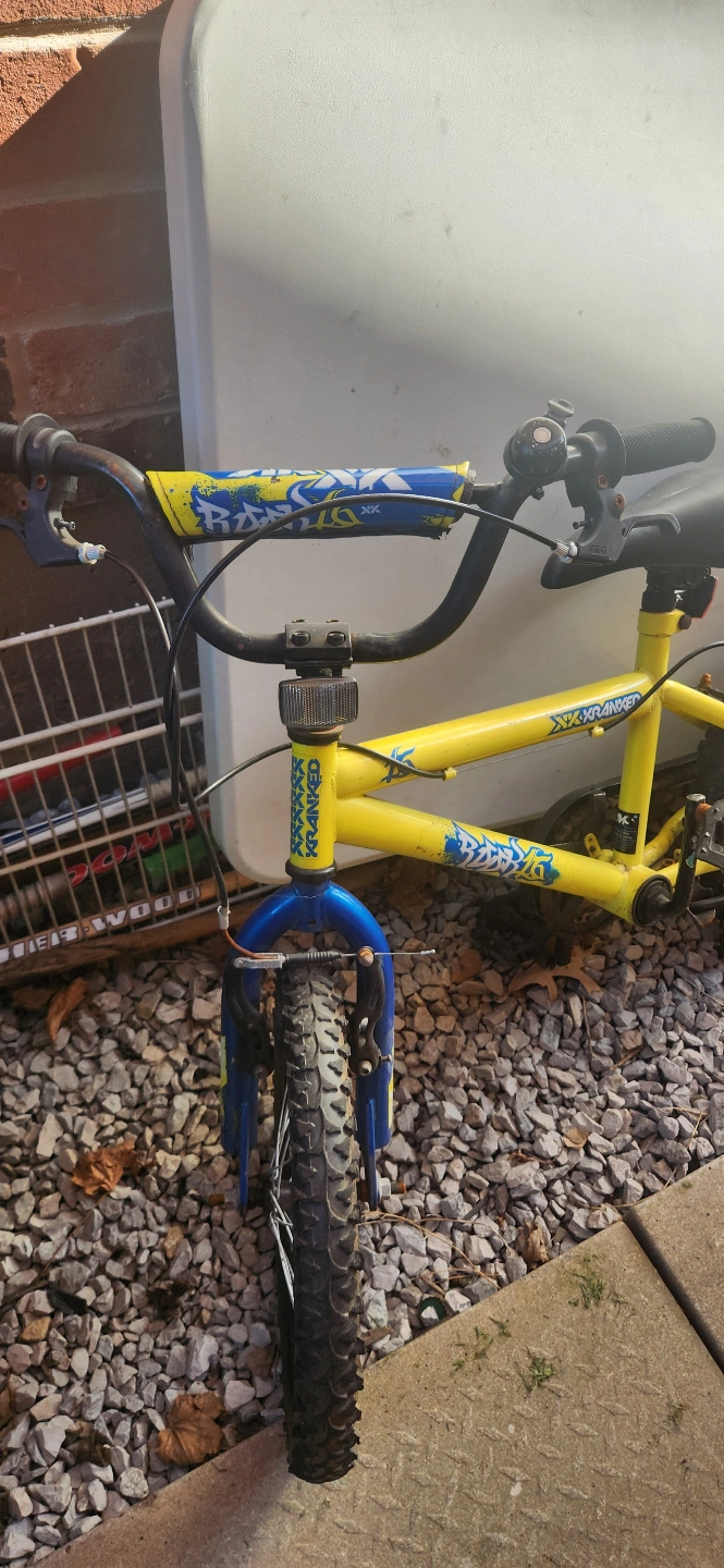 Pre-owned kids' bicycle. Yellow frame, blue accents. Small size, suitable for younger children. Shows some wear from use. Grips and seat included.