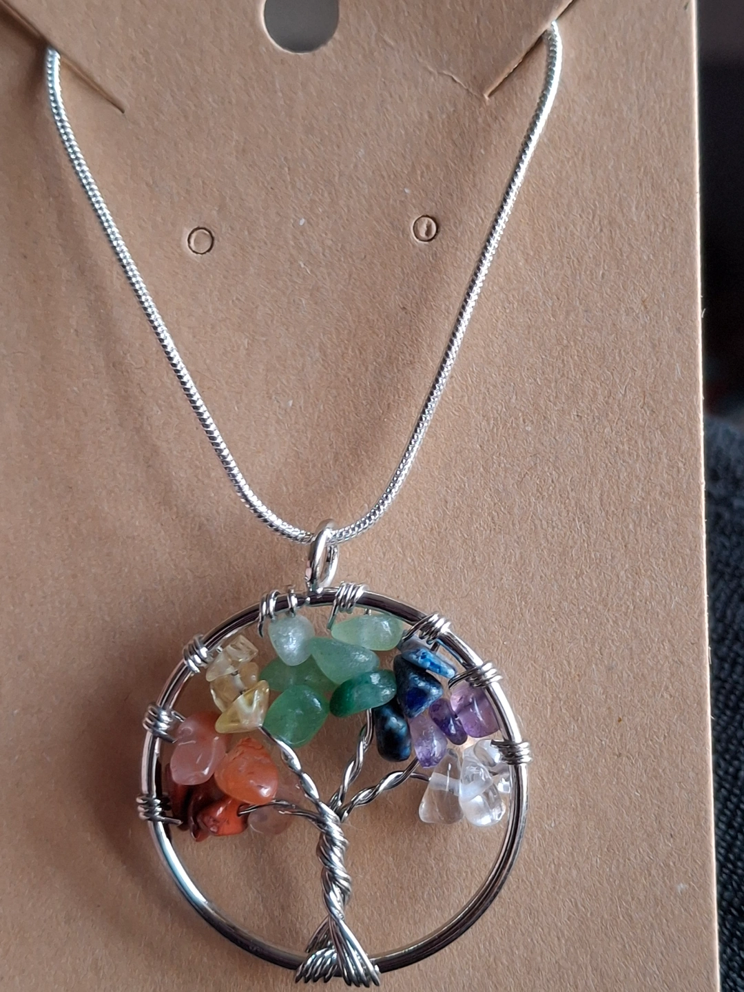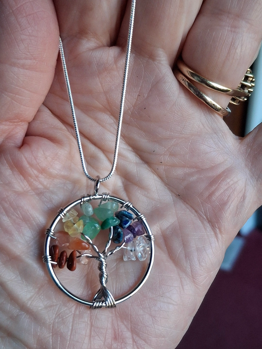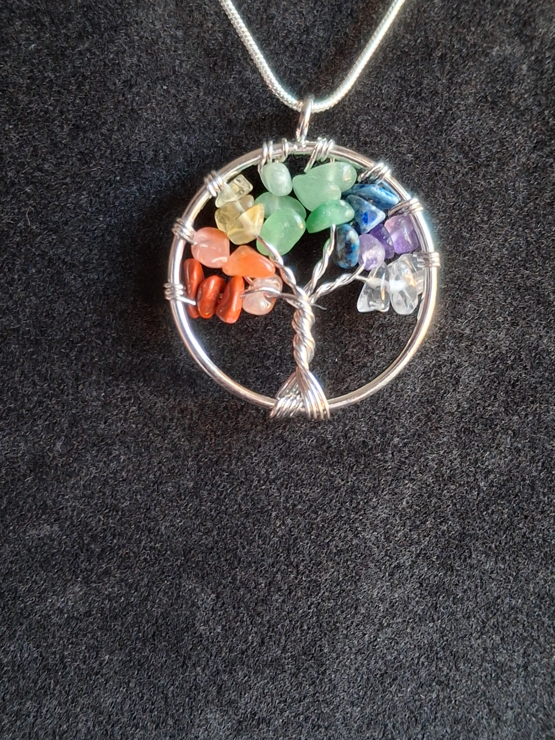 401Beautiful handmade necklace. Features a silver wire wrapped tree of life pendant. Seven chakra stones adorning the branches. Silver snake chain. Unique gift.