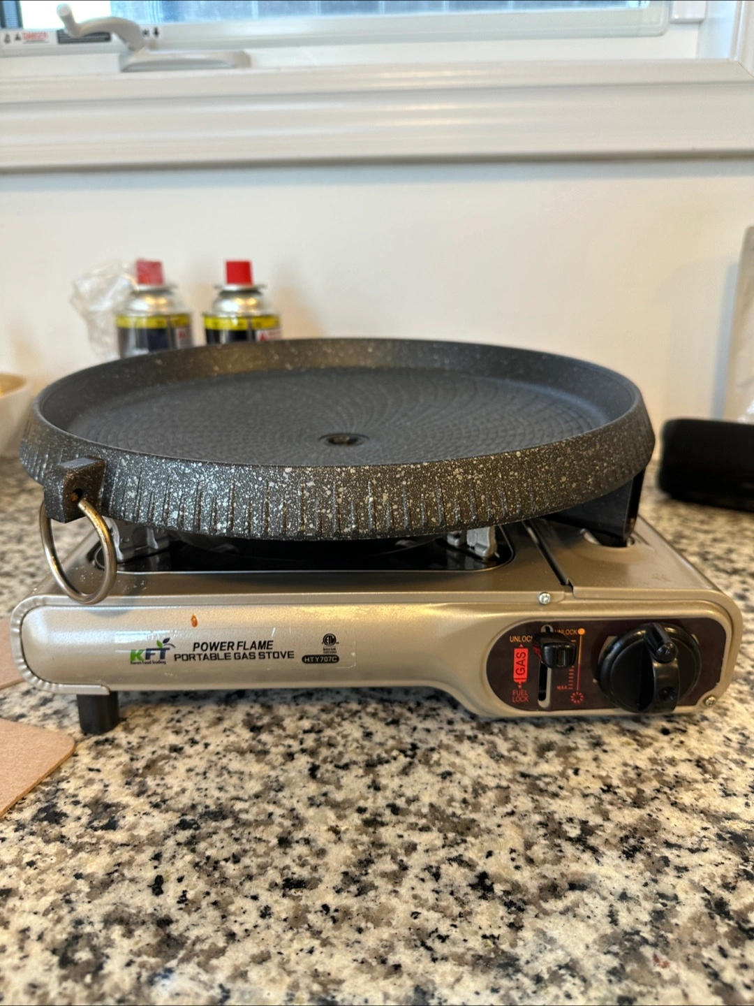 GoodCook brand 6-cup muffin tin. Also included, a rectangular baking pan. KFT brand portable butane gas stove and two Gas Power butane gas cartridges. Some minor staining on the stove.