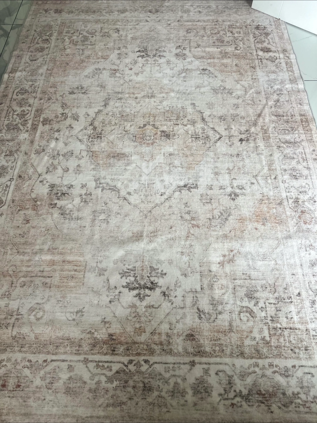 Beautiful beige area rug. Measures 9ft x 6ft. Machine washable. Durable and soft. Non-shedding and colourfast. Perfect for bedroom or living room.