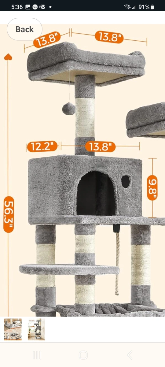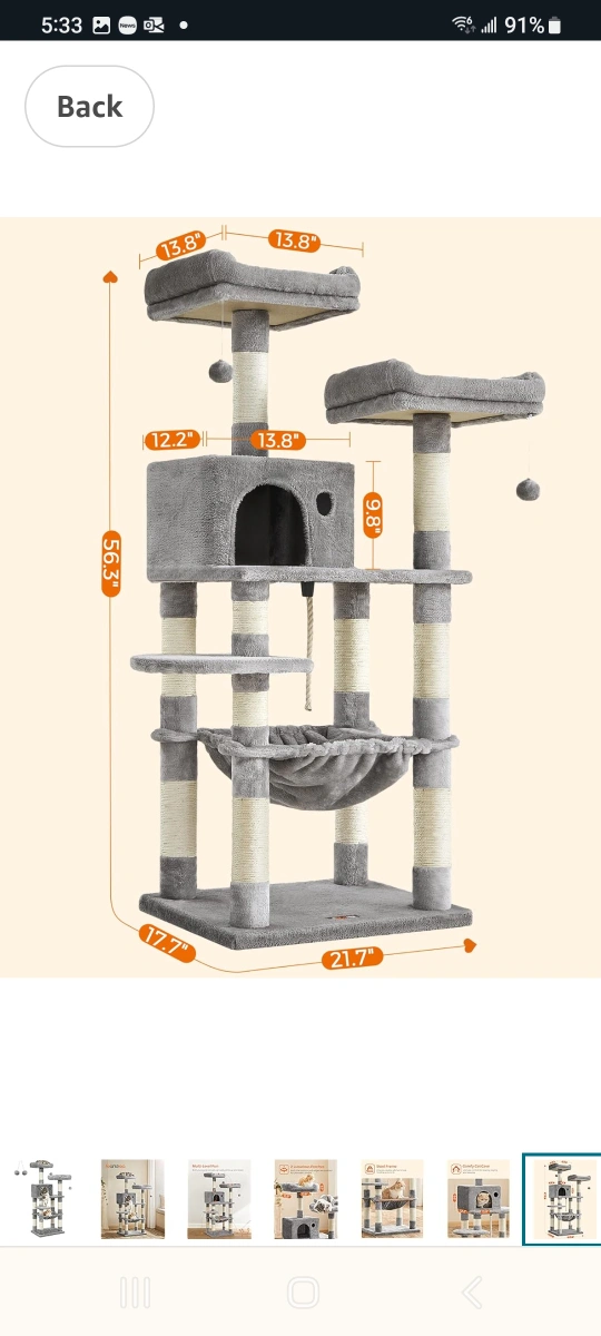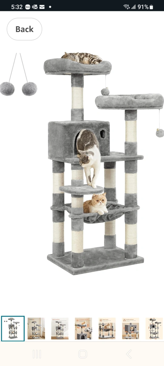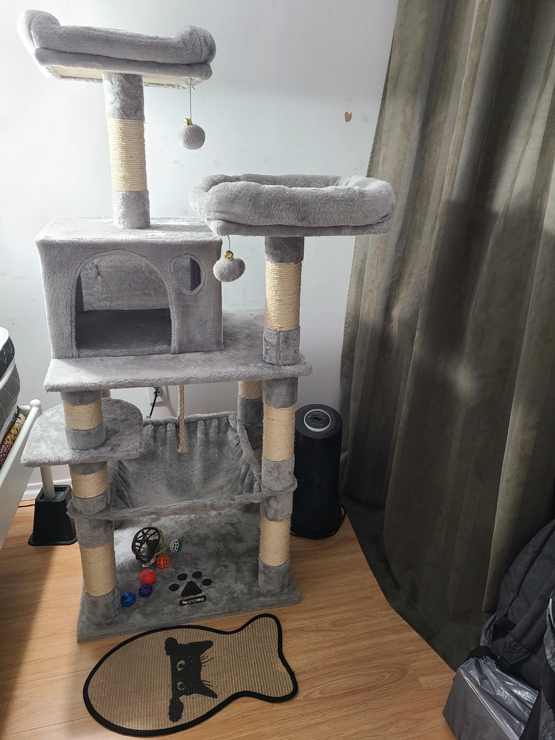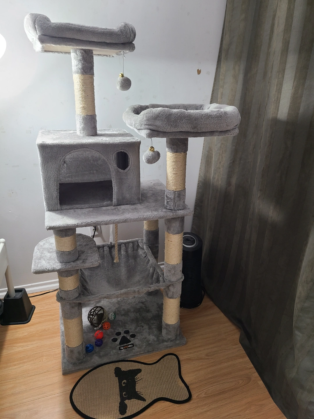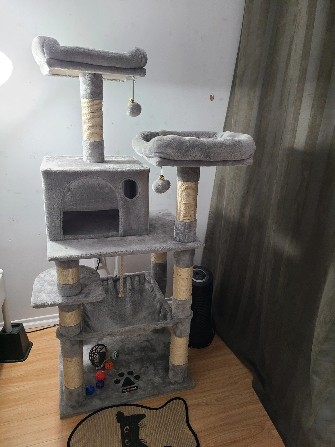 Multi-level cat tree. Grey plush fabric. Sisal-wrapped posts. Several platforms and a hammock. Includes dangling toys. Good for cats to play and relax. Small paw print logo on the bottom.