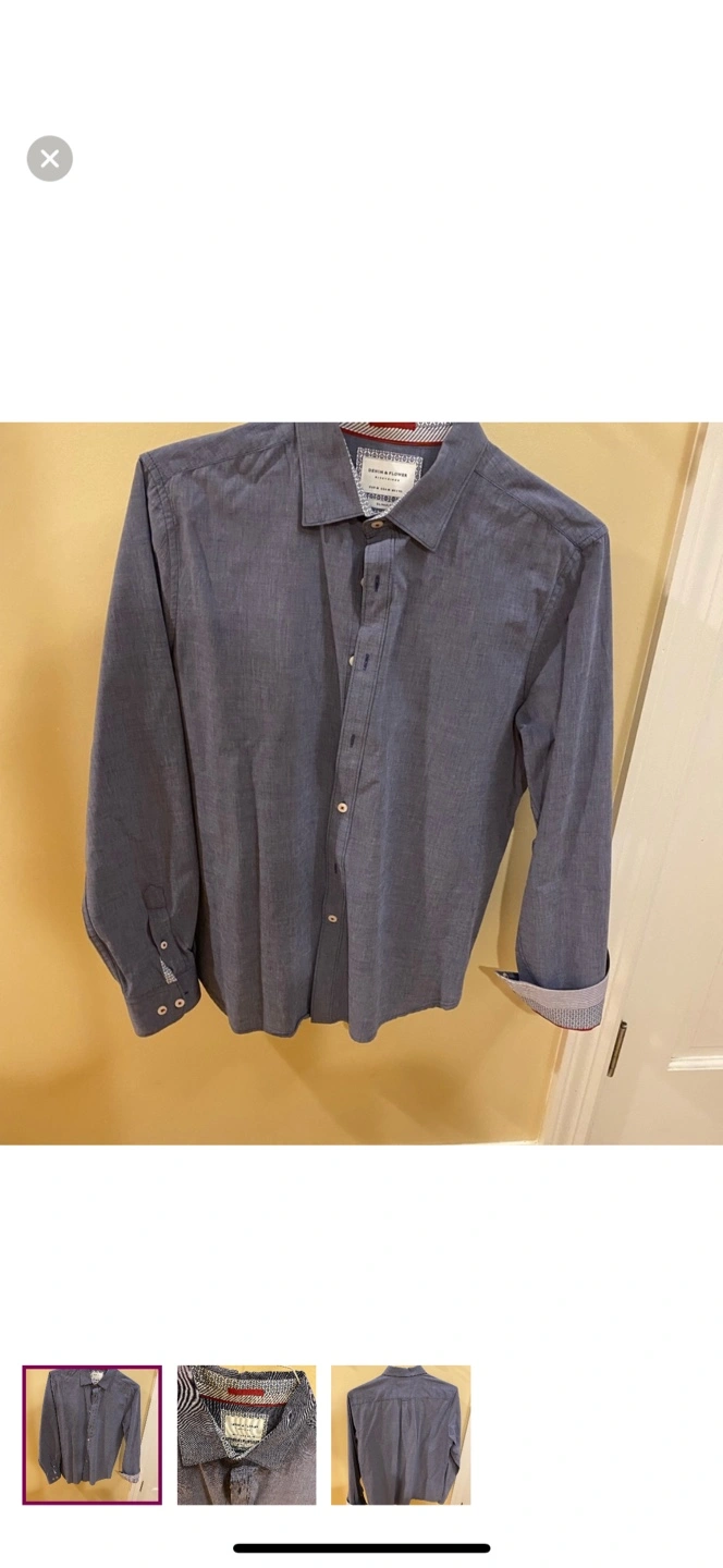 Gray long sleeve button down shirt. Slim fit. Features a patterned inner collar.