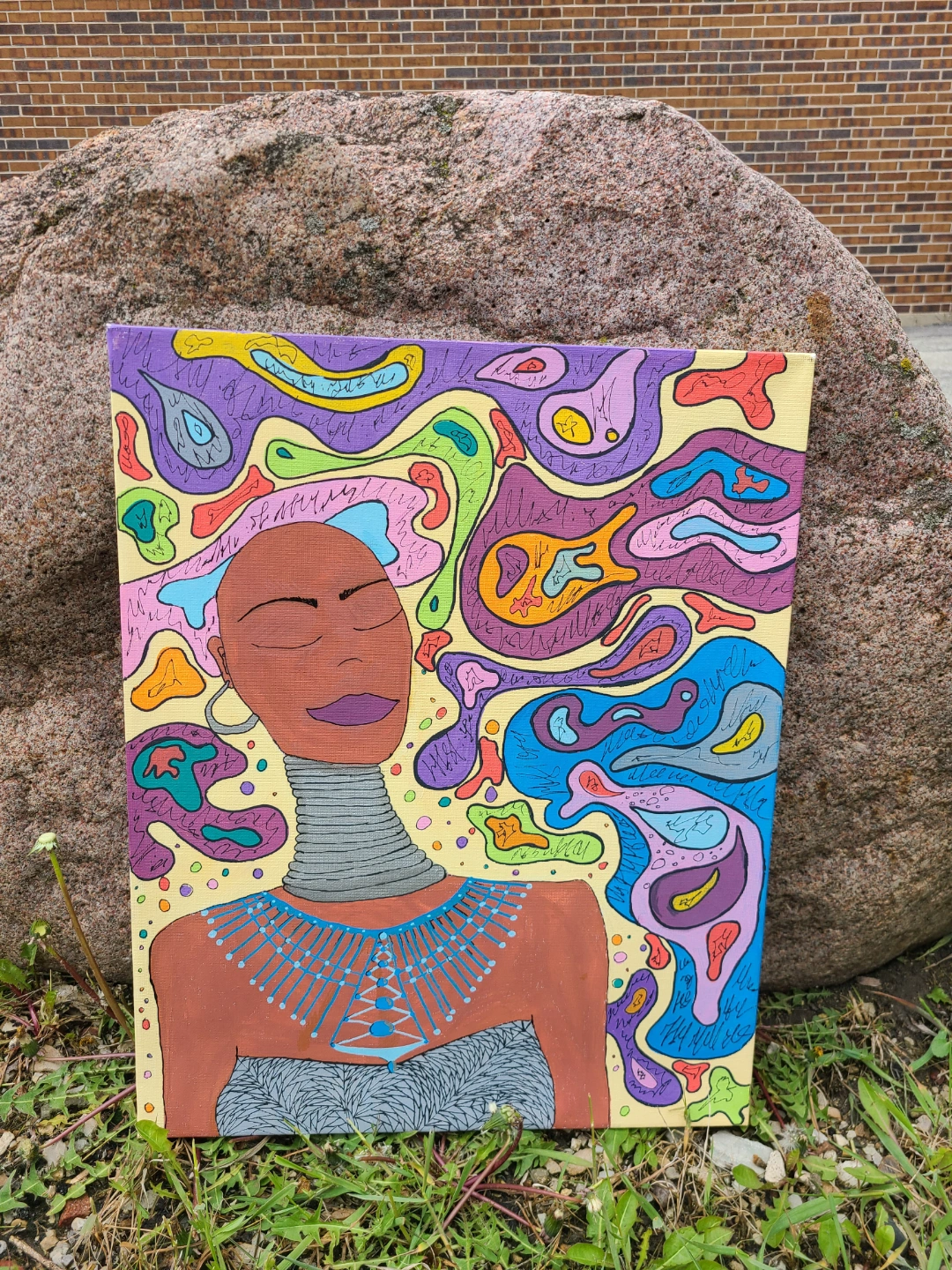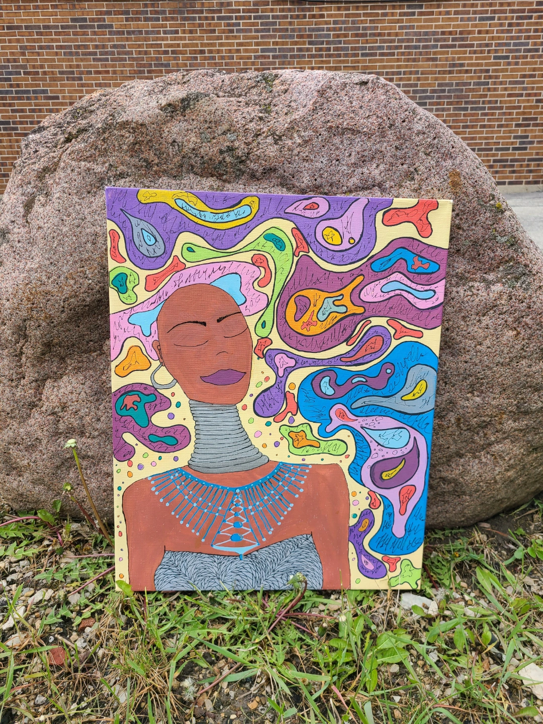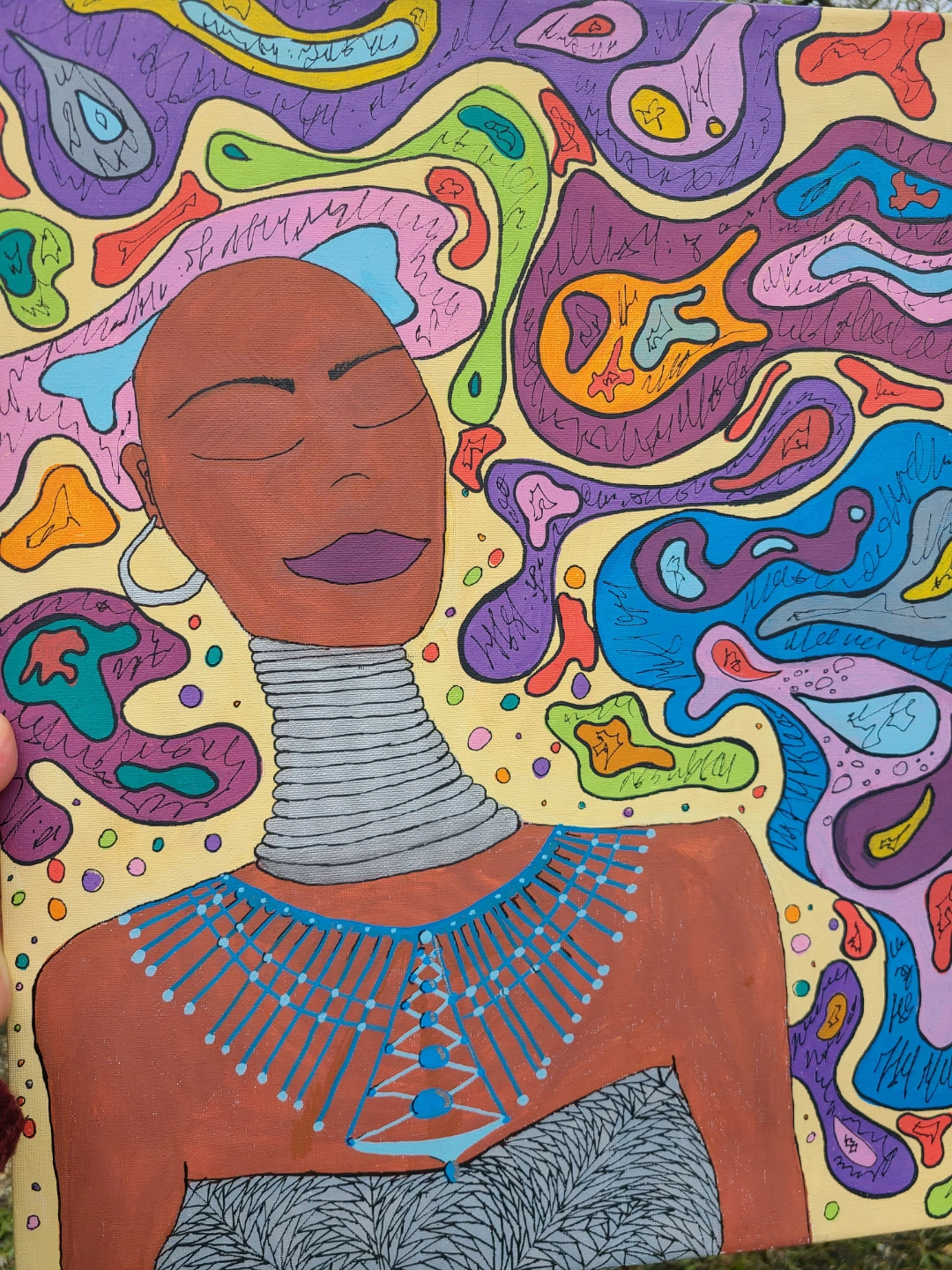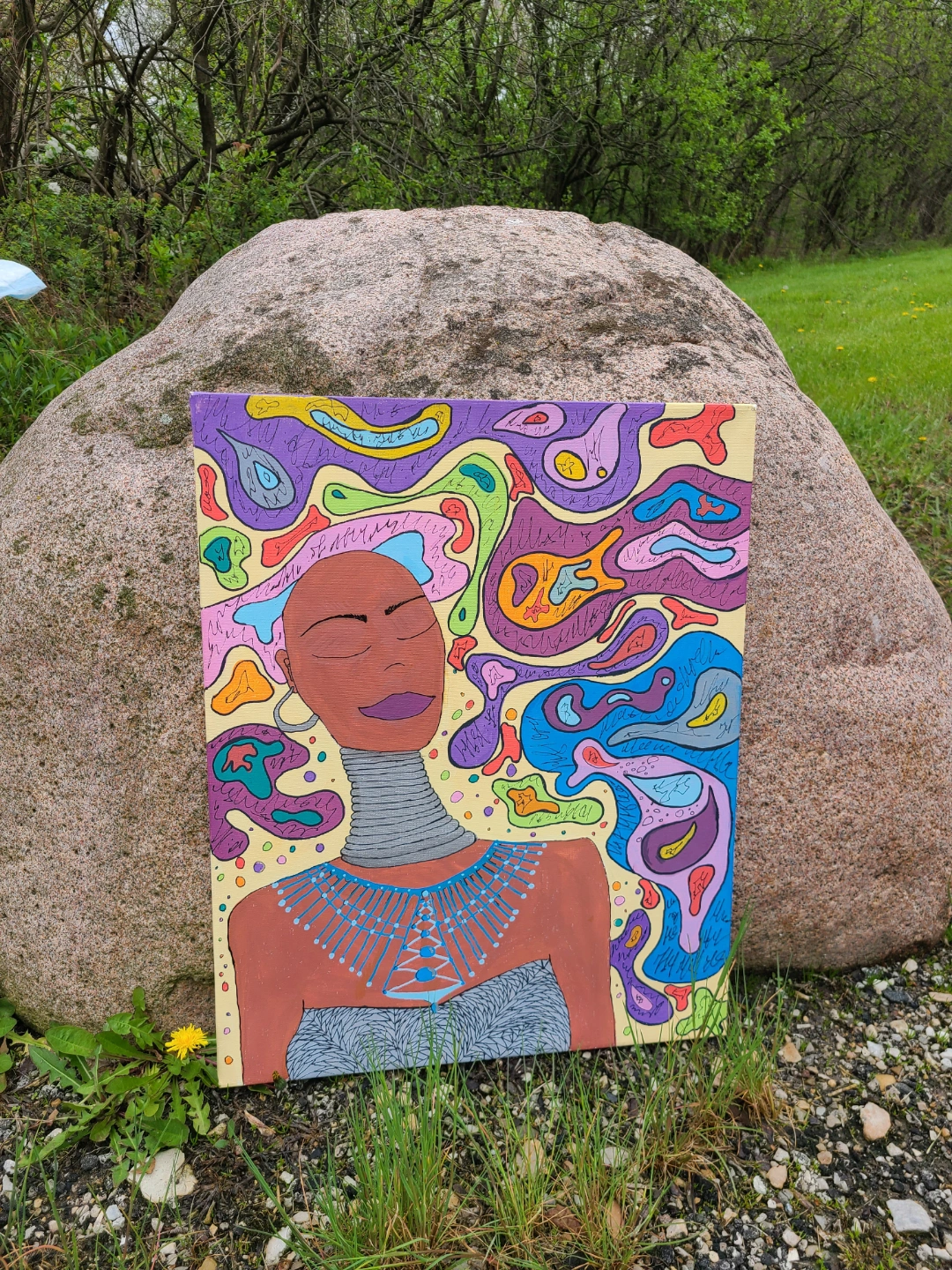 Original artwork. Canvas painting. Colorful abstract style. Depicts a woman with a unique necklace. Eye-catching piece for any art collector.