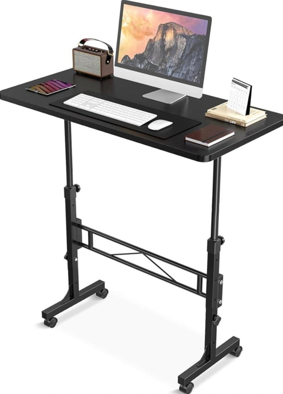 Height-adjustable mobile desk. Features lockable rollers. 32"L x 16"W desktop. Supports up to 200 pounds. Easy assembly. Includes all hardware and instructions.