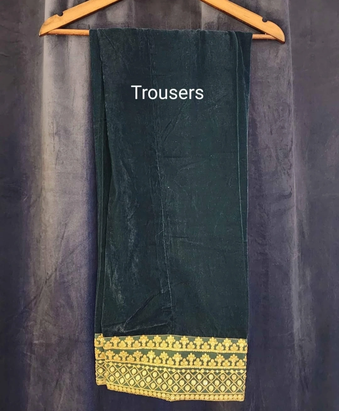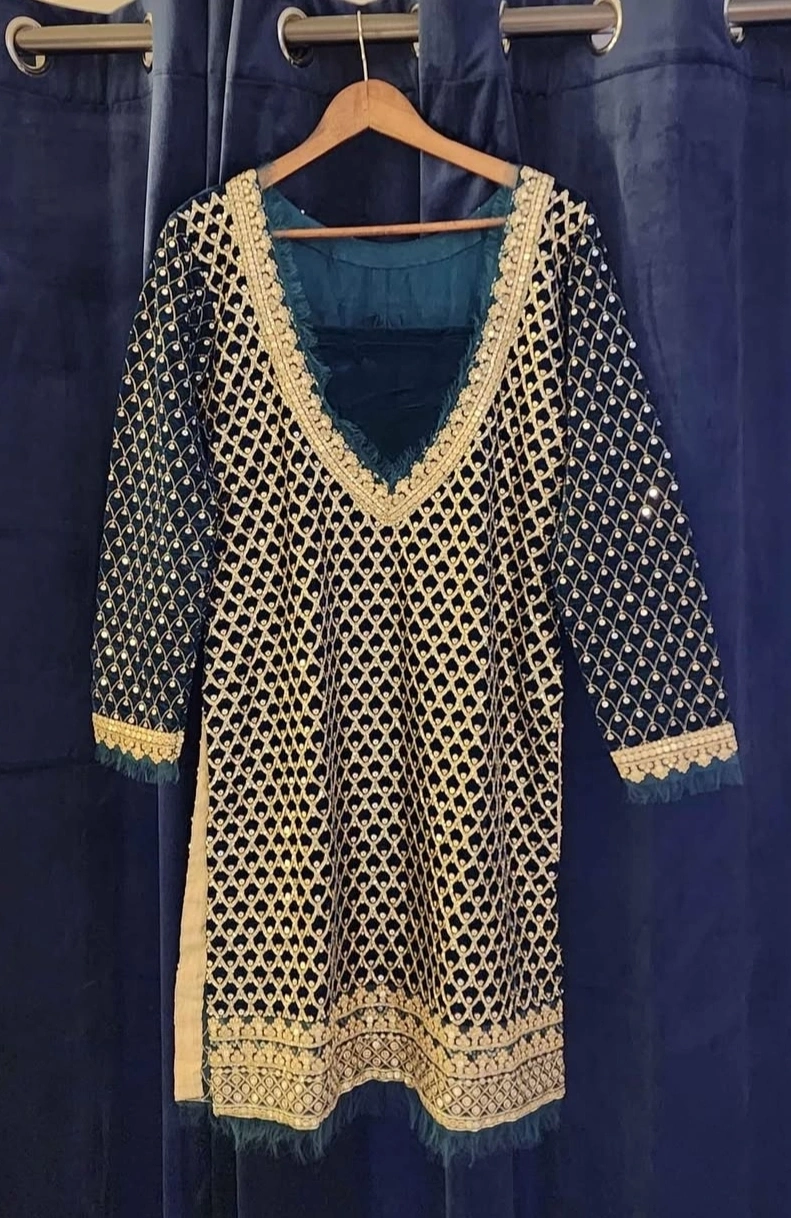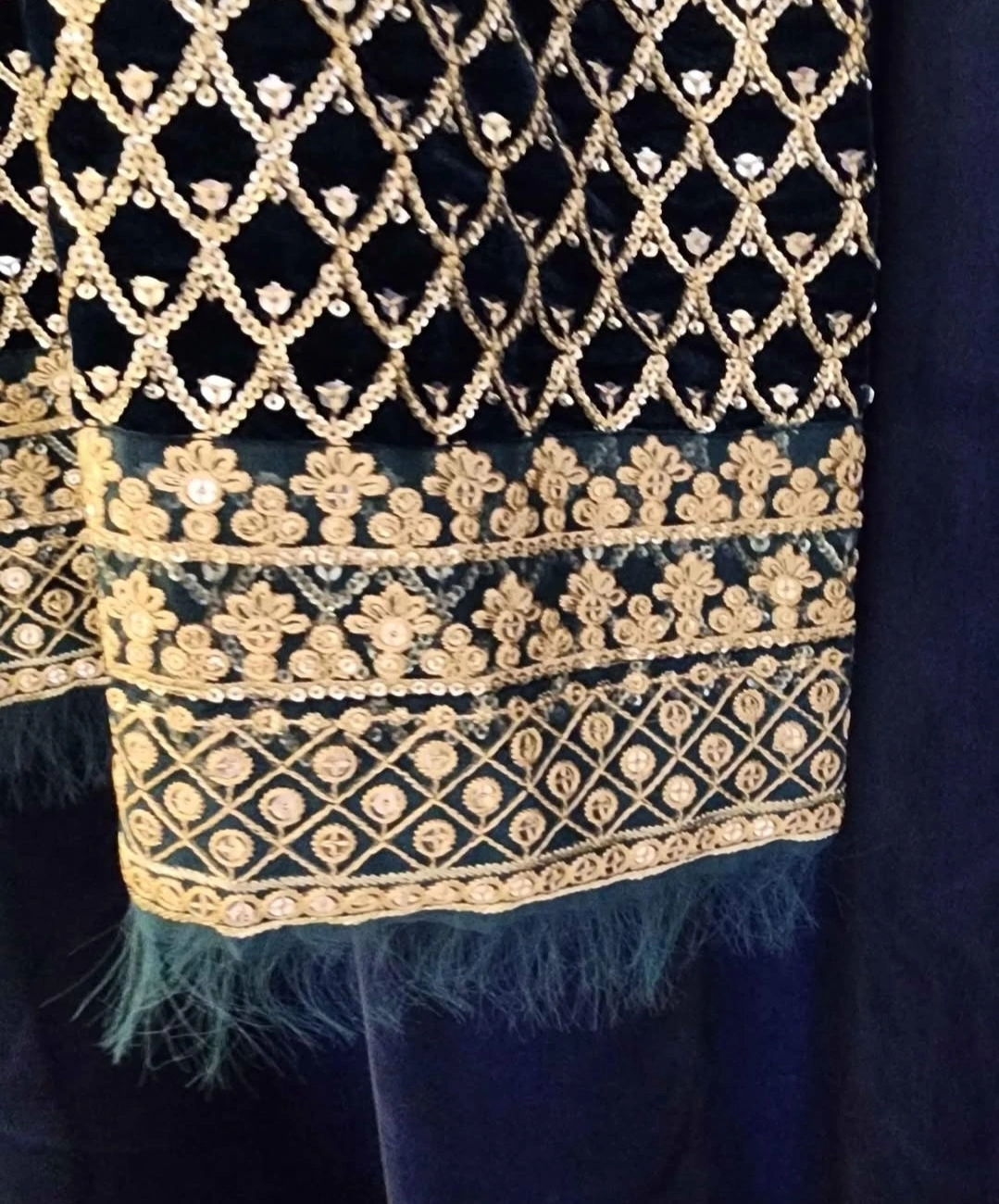 Beautiful dark teal velvet shalwar kameez. Features intricate gold embroidery throughout. Kameez has three-quarter sleeves and a V-neck. Shalwar has gold embroidery at the bottom. Stunning outfit for special occasions.