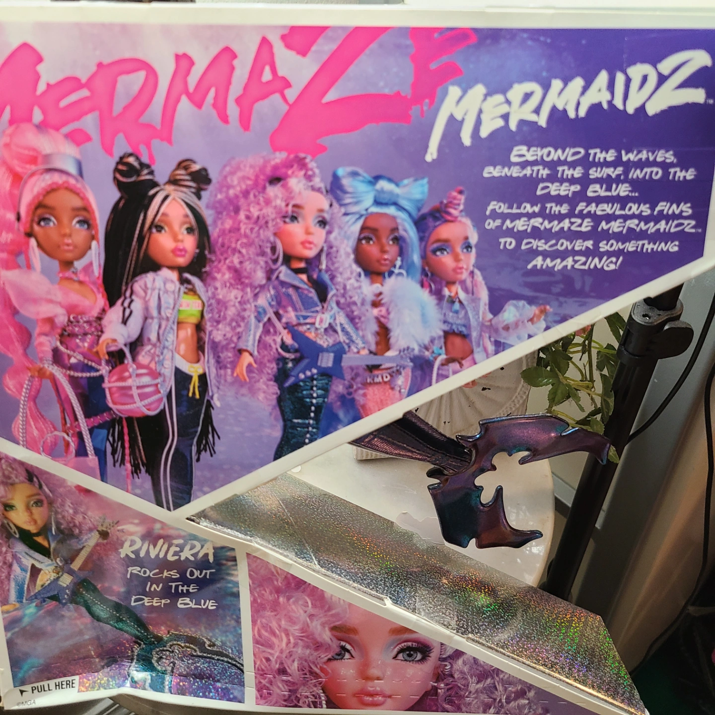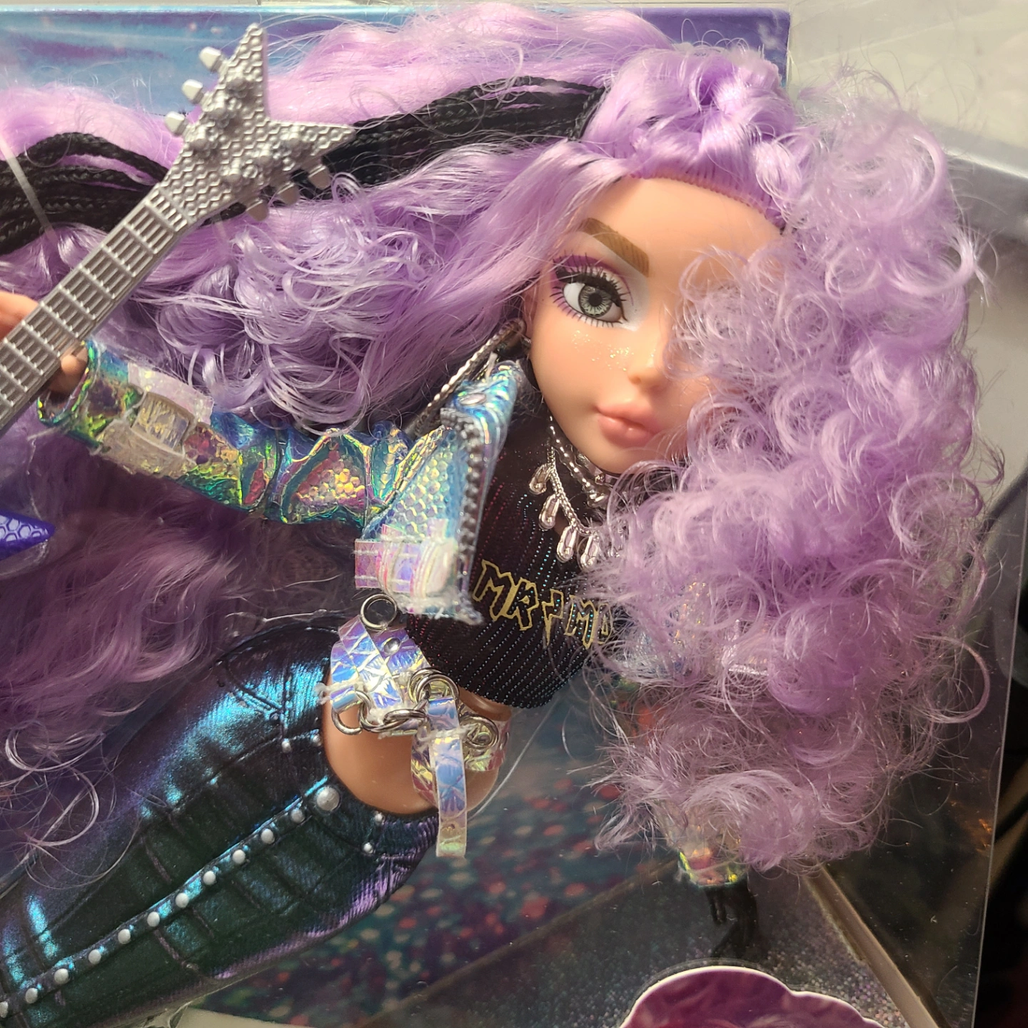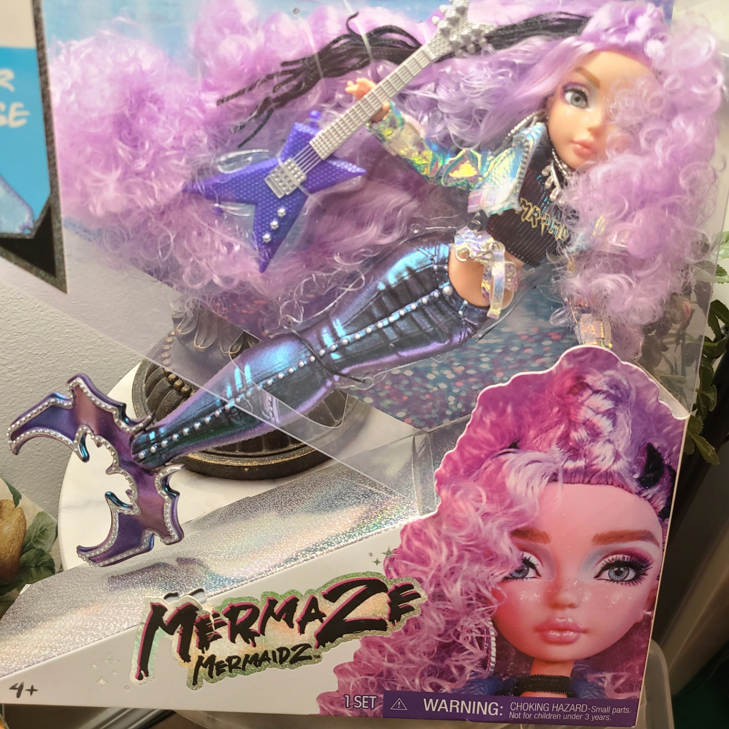 18New in box. Collectible fashion doll. Purple hair, mermaid tail, guitar. Part of the Mermaze Mermaidz line.