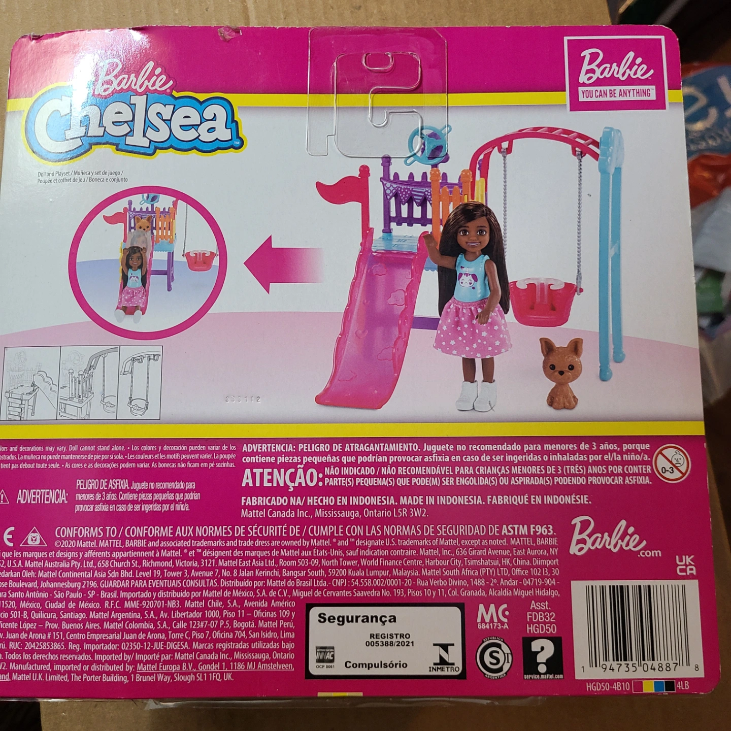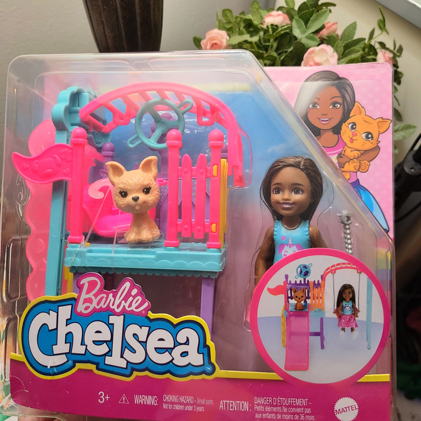 18Adorable Barbie Chelsea doll playset. Includes a small playground, slide, swings, and a cute puppy. Perfect for imaginative play. For ages 3+
