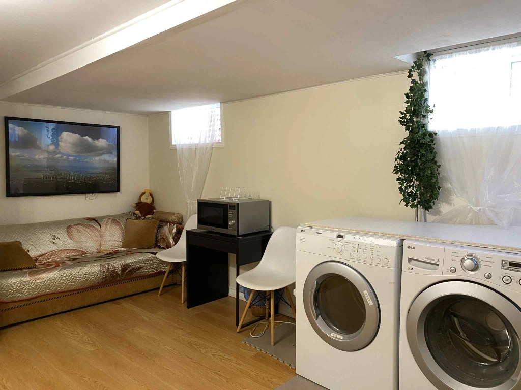 Furnished renovated clean bsmt room w bath and private entrance (via spaceous sitting/laundry room used twice a week 7-9 pm on schedule). Unlimited wifi, microwave, fridge, kettle. Parking on street.