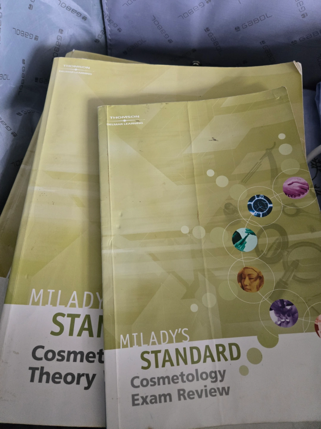 Milady's Standard Cosmetology textbook and exam review workbook. Used condition. Good for students.