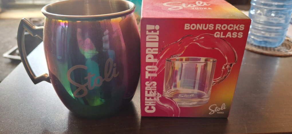 Brand new Stoli Vodka mug and bonus rocks glass set, still in the original packaging! The mug has a cool iridescent finish. Perfect for your home bar or as a gift for a vodka enthusiast!
