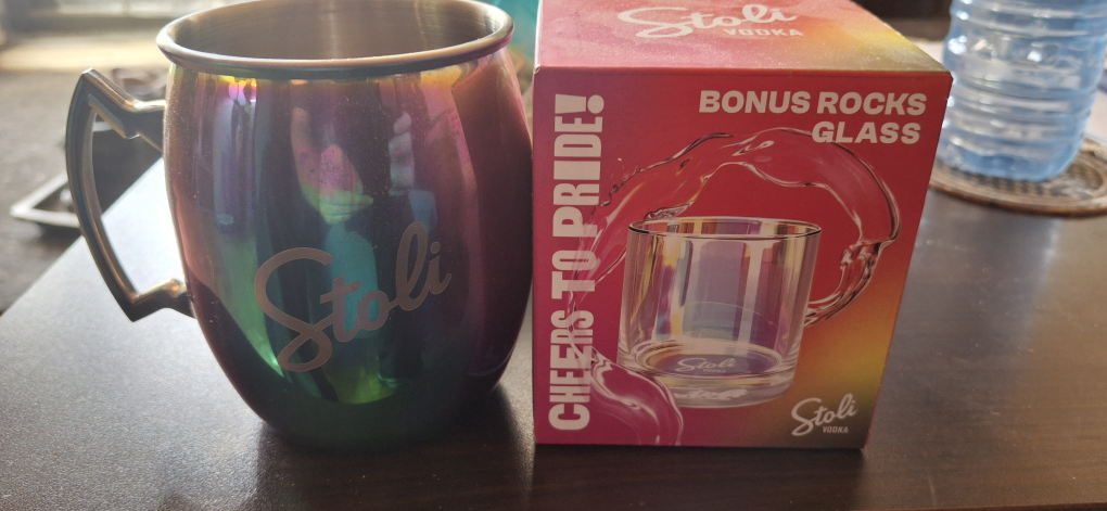 Brand new Stoli Vodka mug and bonus rocks glass set, still in the original packaging! The mug has a cool iridescent finish. Perfect for your home bar or as a gift for a vodka enthusiast!