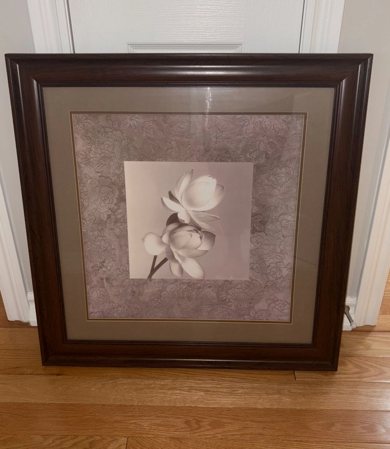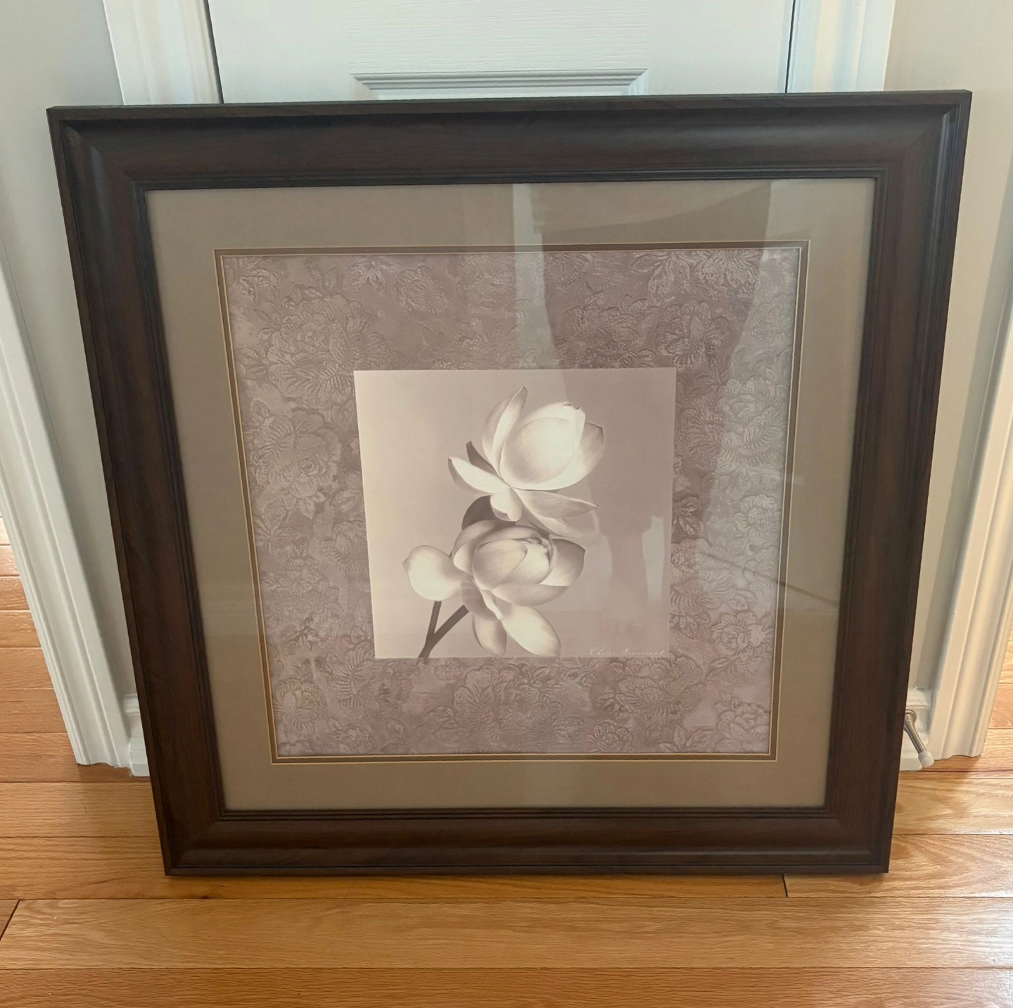 It's time for another home to enjoy this beautiful framed print. Features two lotus flowers. Dark brown frame. Neutral colours. Perfect for home decor. Print #050