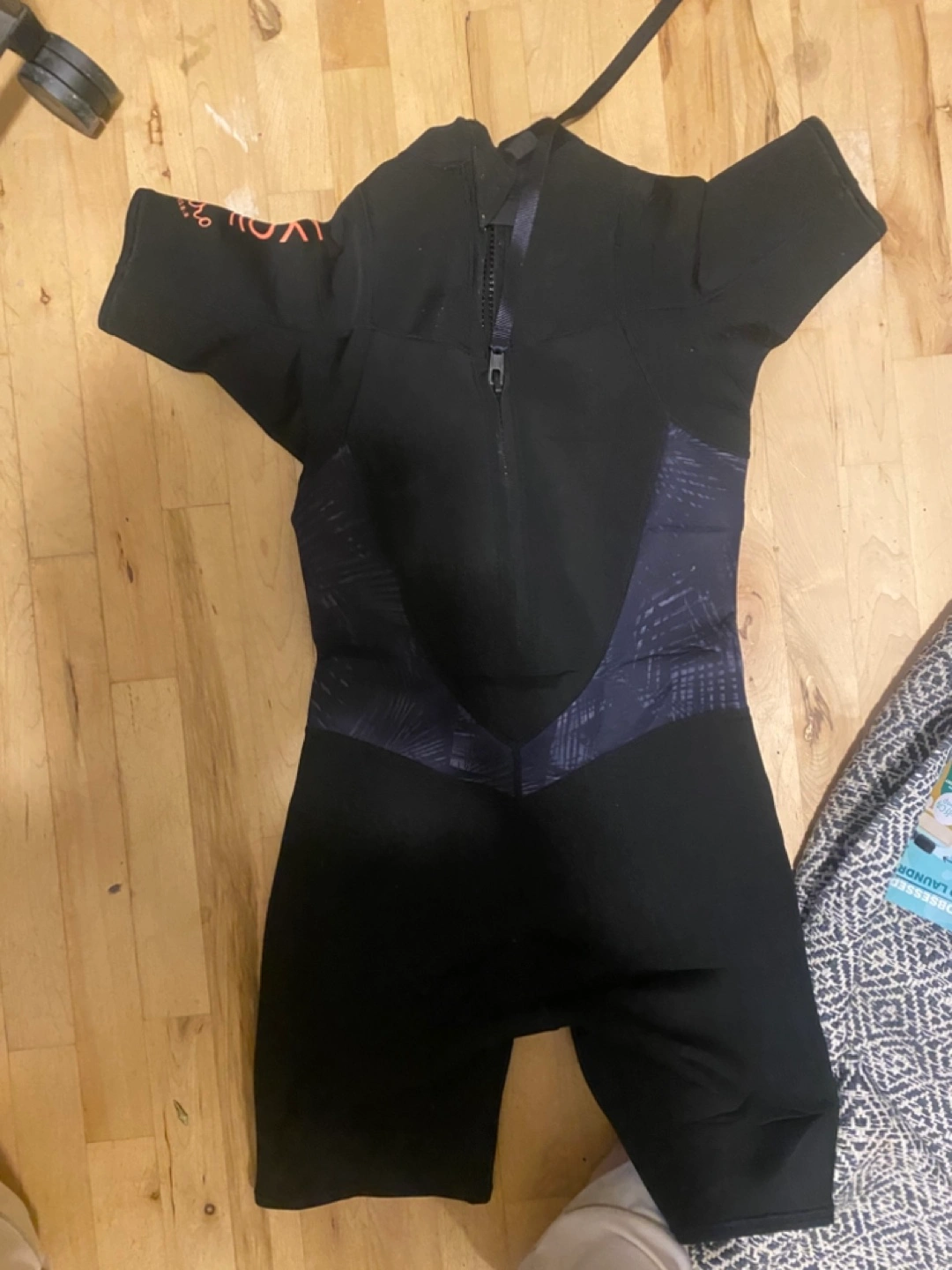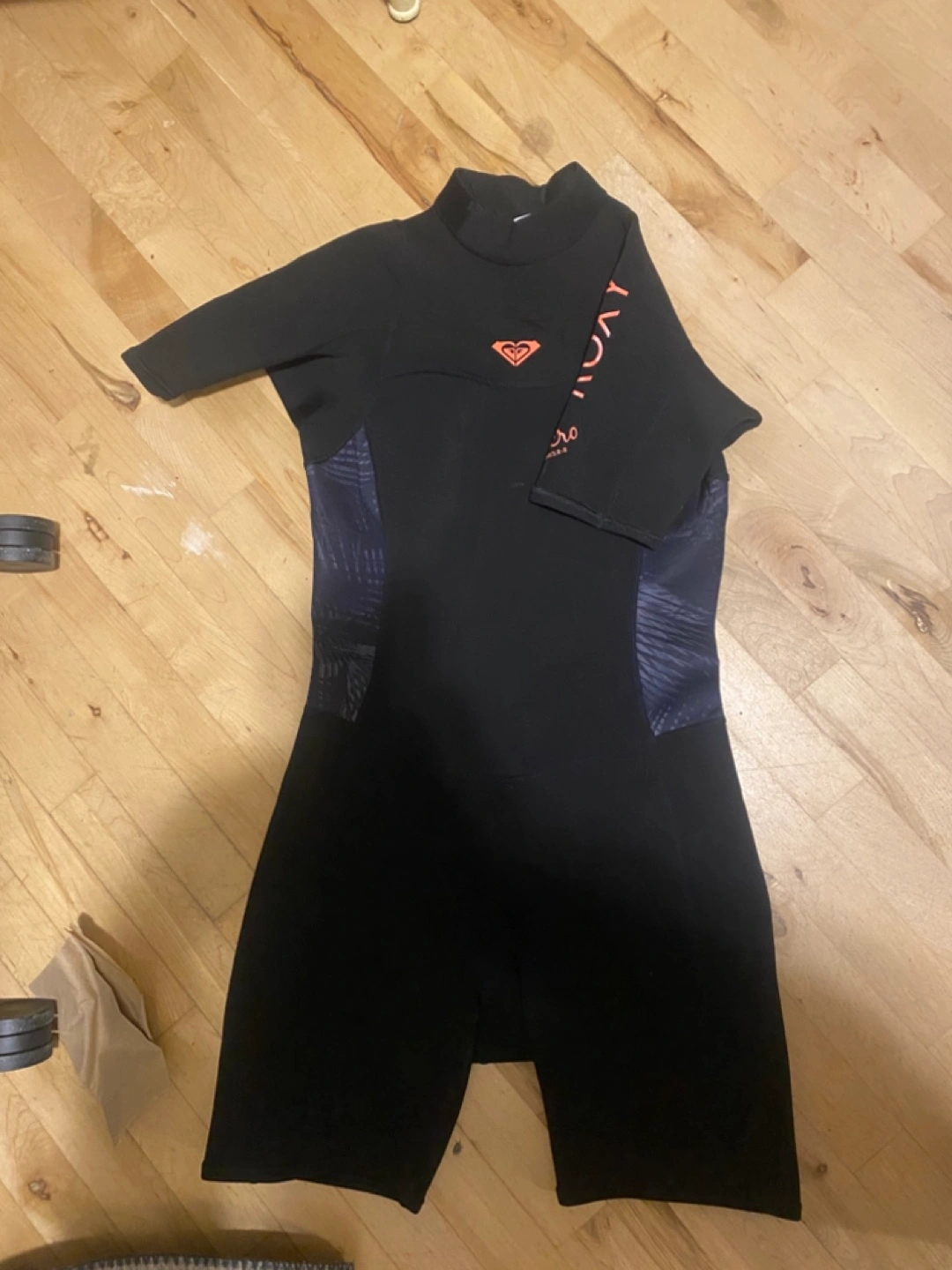 Black short sleeve spring suit. Size 10 and other details are not visible. Some graphic detailing on the sides. Back zipper closure
