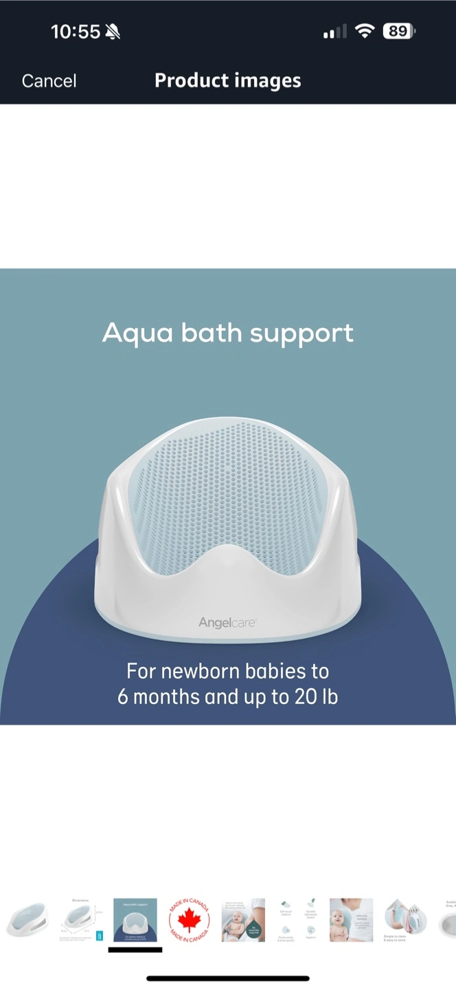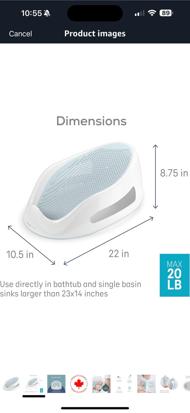 83Baby bath support. Suitable for newborns to six months or up to 20 lbs. Made in Canada. Use in bathtub or large single basin sinks.
