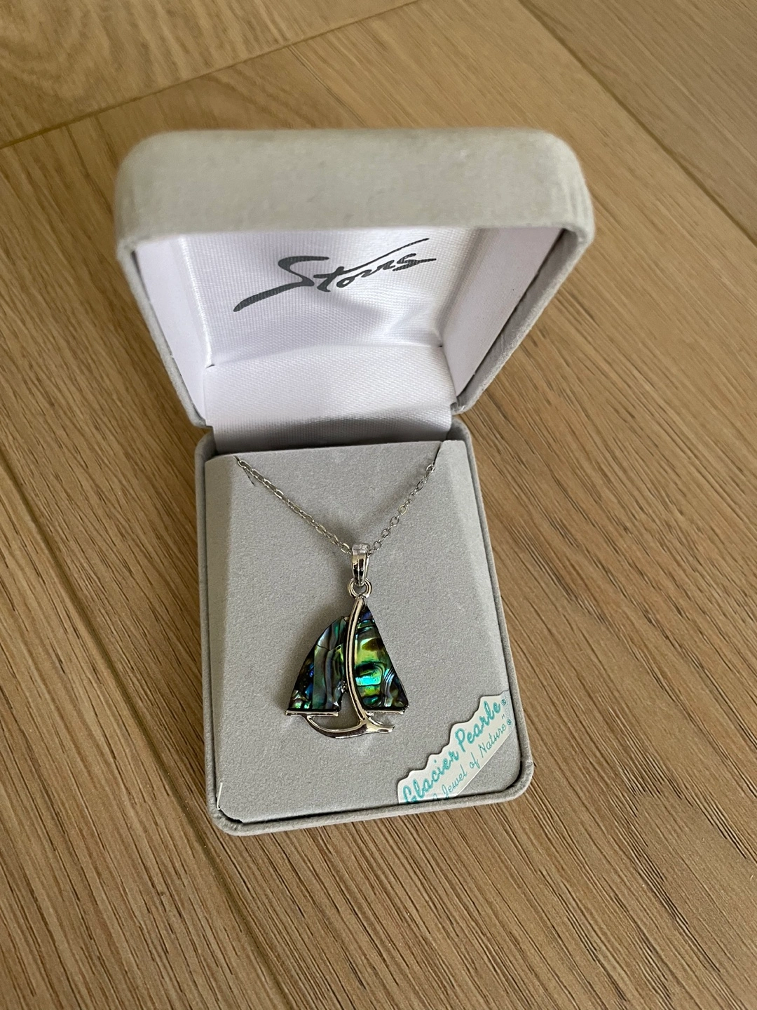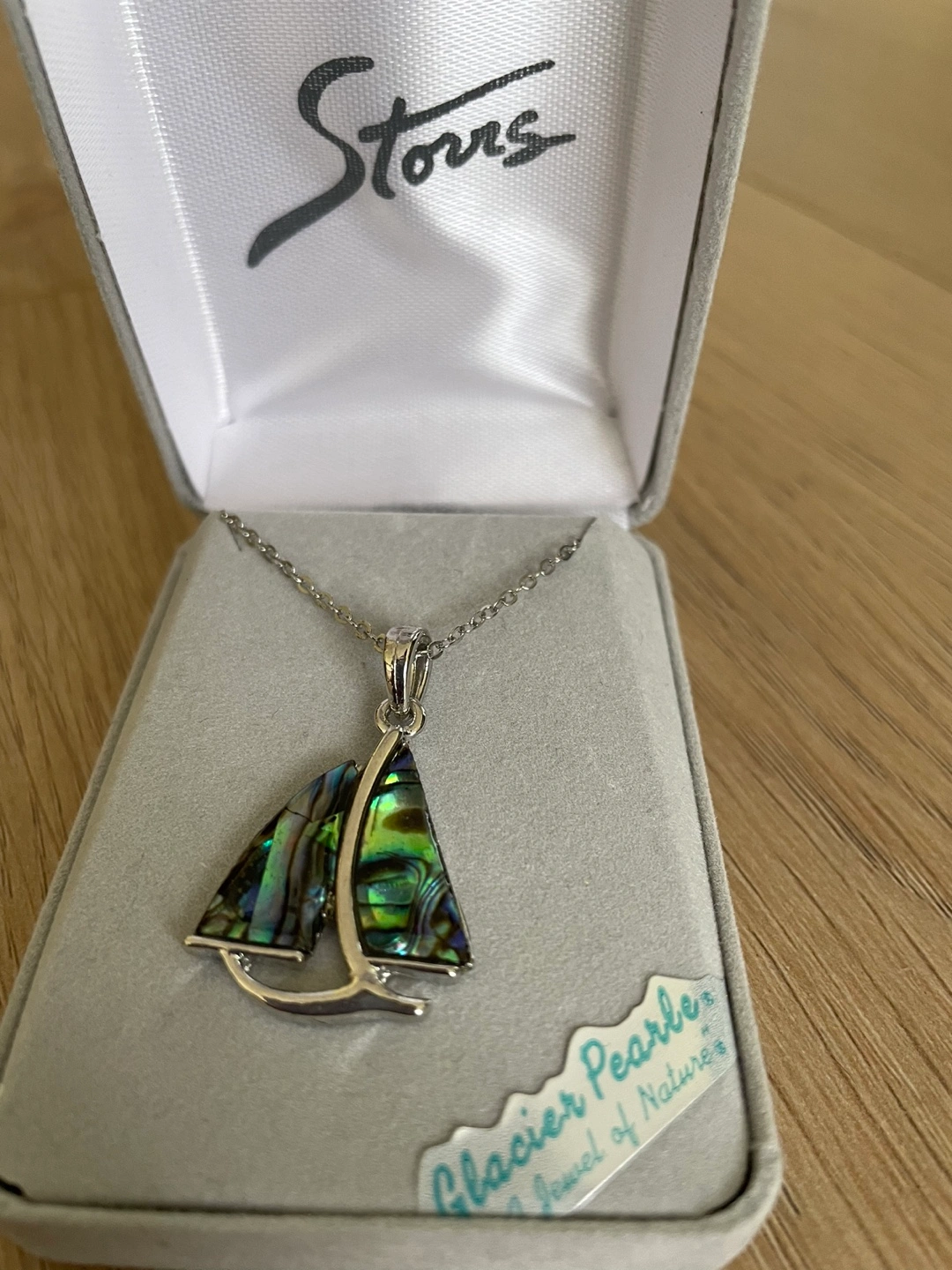 Beautiful sailboat pendant necklace. Silver chain and abalone shell detail. Comes in original box. Perfect gift.