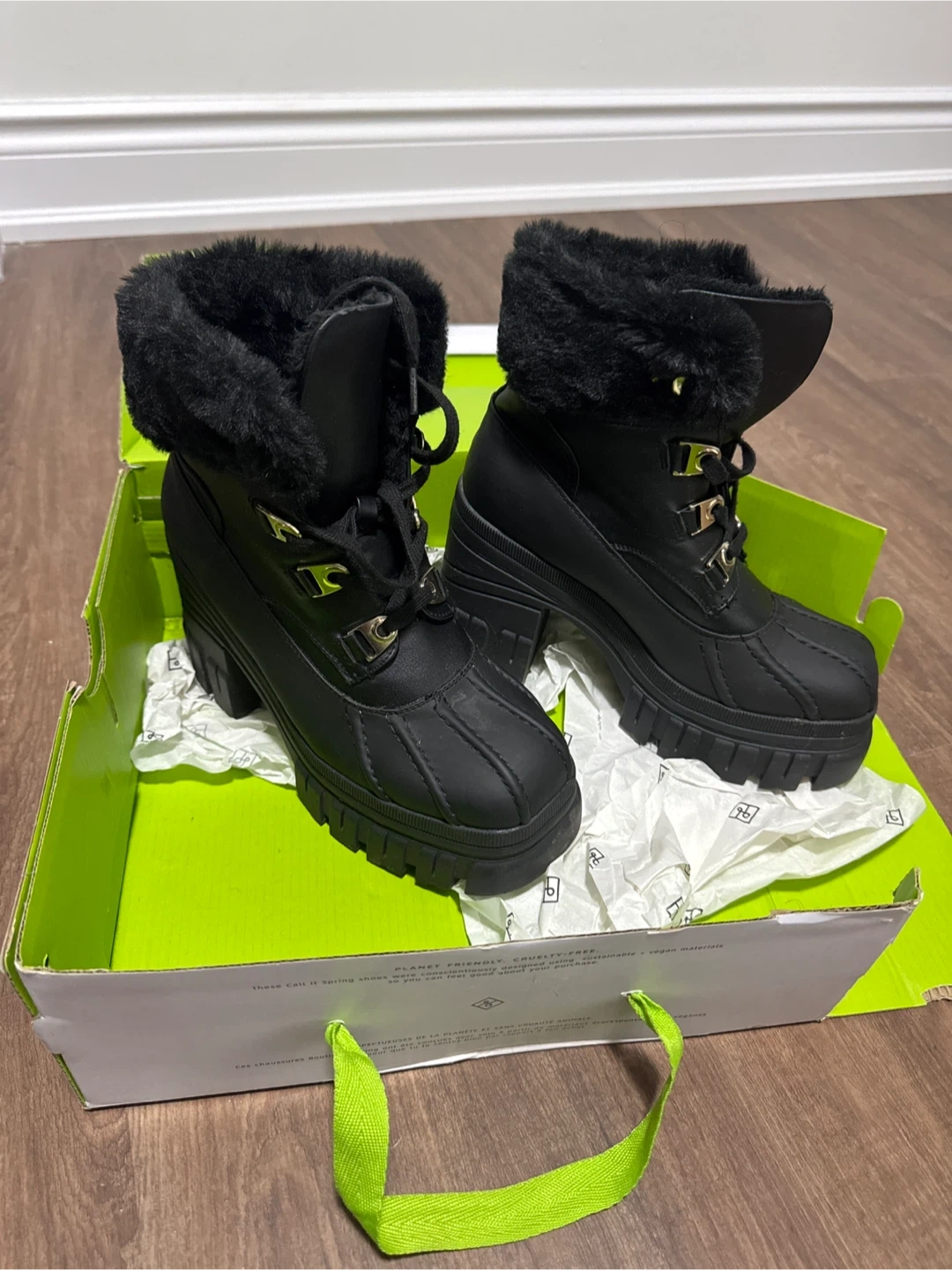 Selling a pair of Call It Spring Apreski boots in size 8. These black boots feature faux fur and come in the original box! They're super cute and ready for the winter season