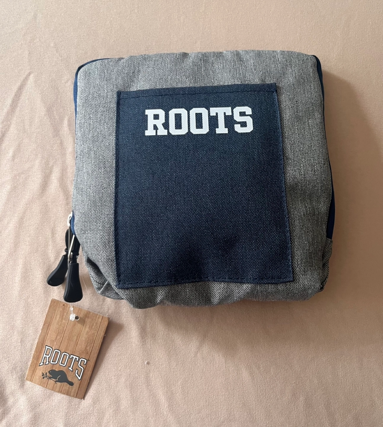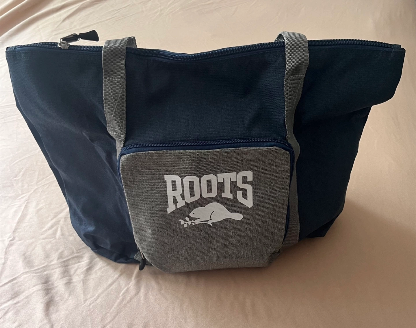 Lightweight, packable tote bag. Features a zipper closure, two main compartments, and a small front pocket. Grey and navy colour scheme. Perfect for shopping or travel. Folds into a square pouch for compactness when you are not using it.