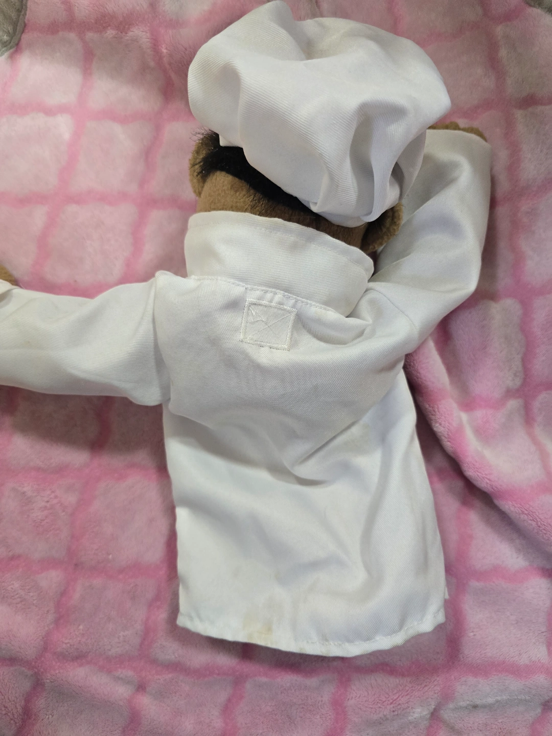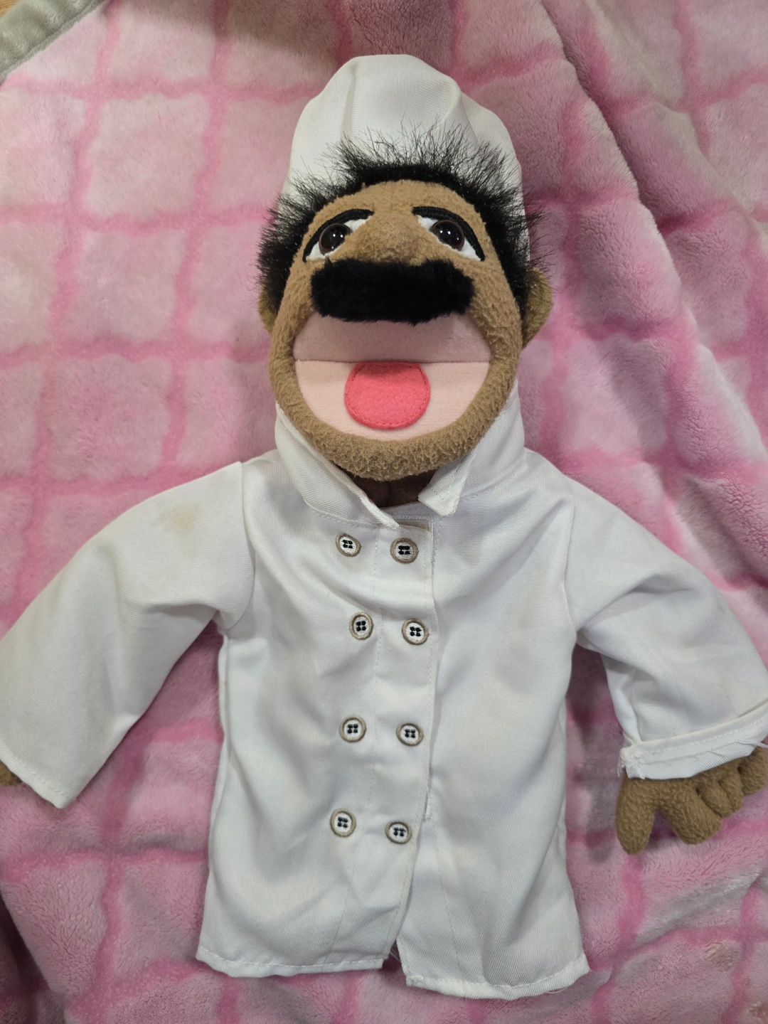 1000+Adorable chef puppet. Brown skin, dark mustache. White chef jacket and hat. Great for imaginative play. #freecycle