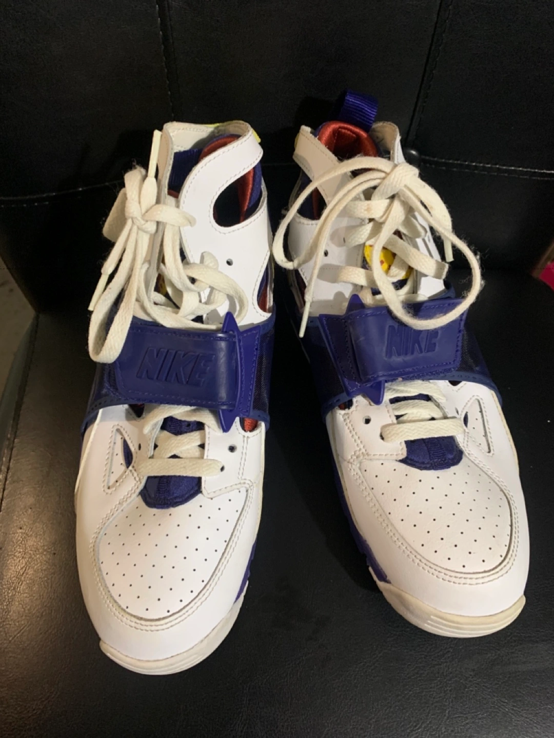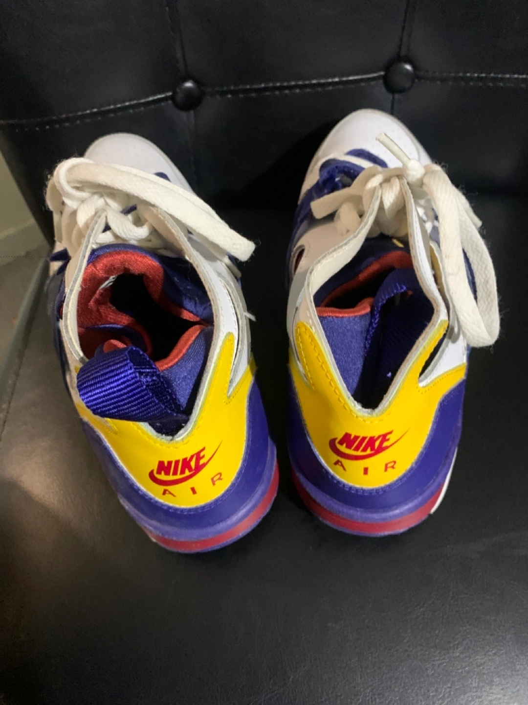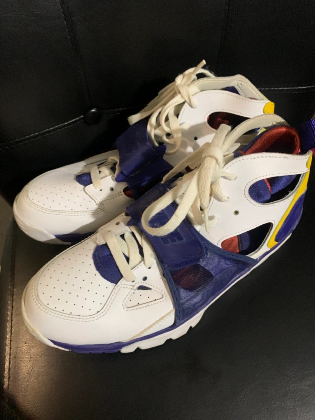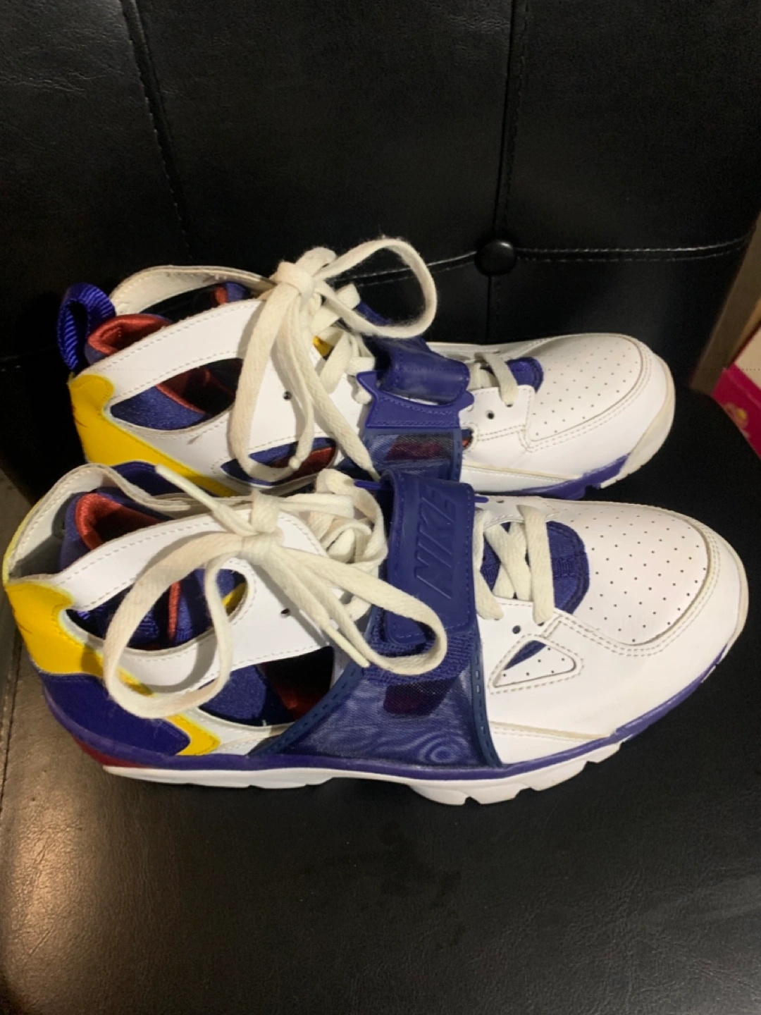 Pre-owned Nike Air Flight Huarache sneakers. White, purple, and yellow colourway. High-top design with adjustable straps. Lace-up closure. Show some wear.