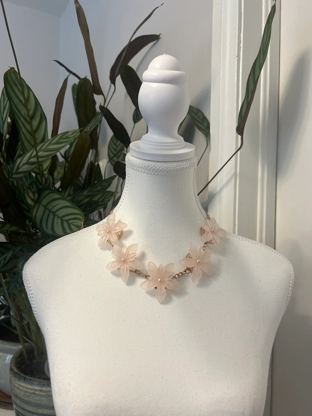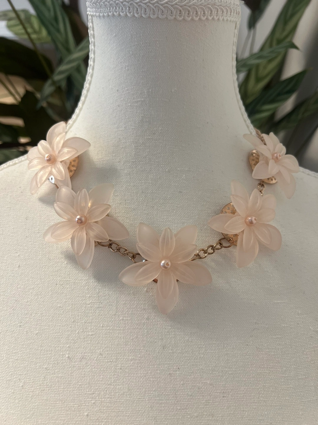 374Beautiful blush pink flower necklace. Features frosted pink flowers and gold chain. Perfect for adding a touch of elegance to any outfit.
