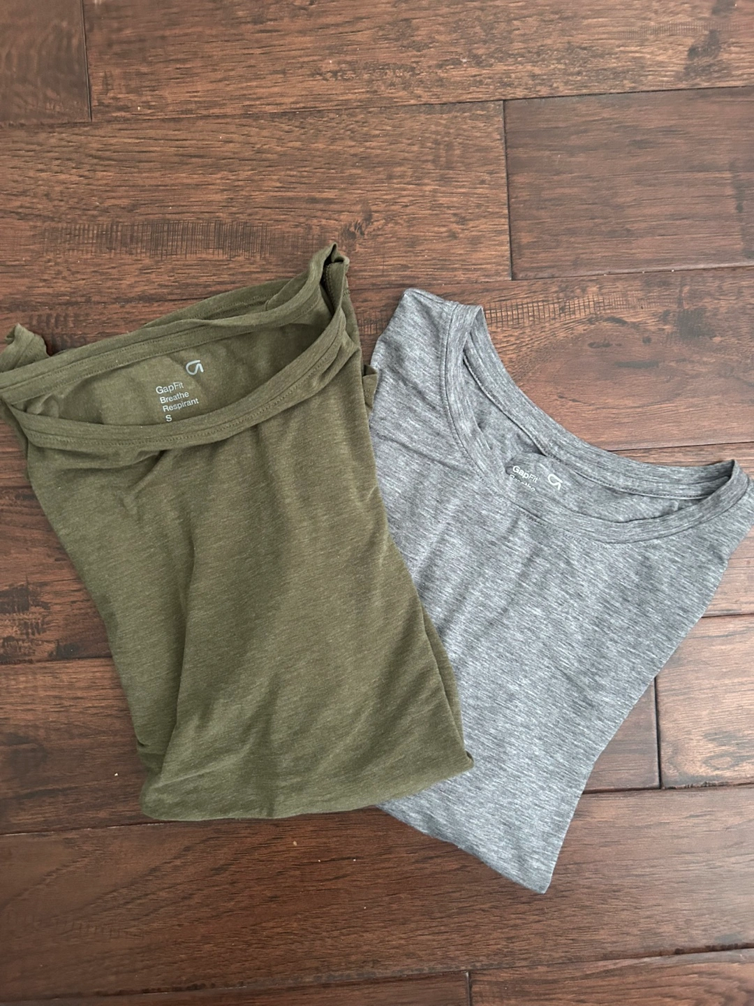 Two GapFit Breathe Respriant t-shirts. One grey cropped, size medium. One olive green, with wide neck and open sides, size small. Soft, breathable fabric. Great condition.