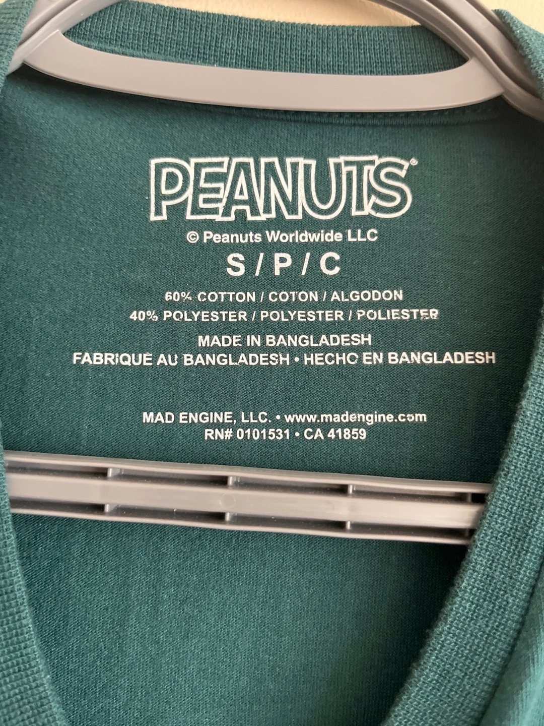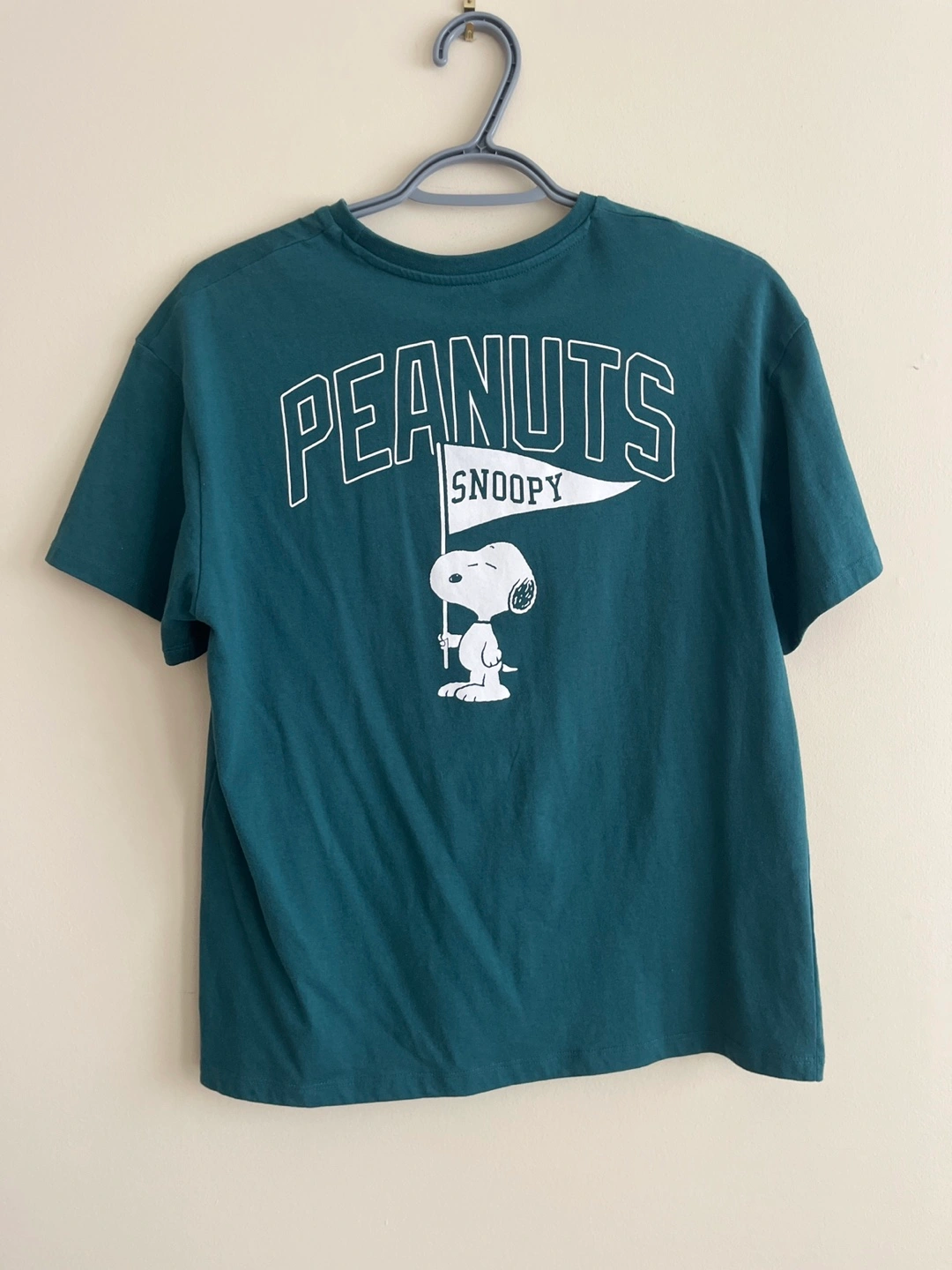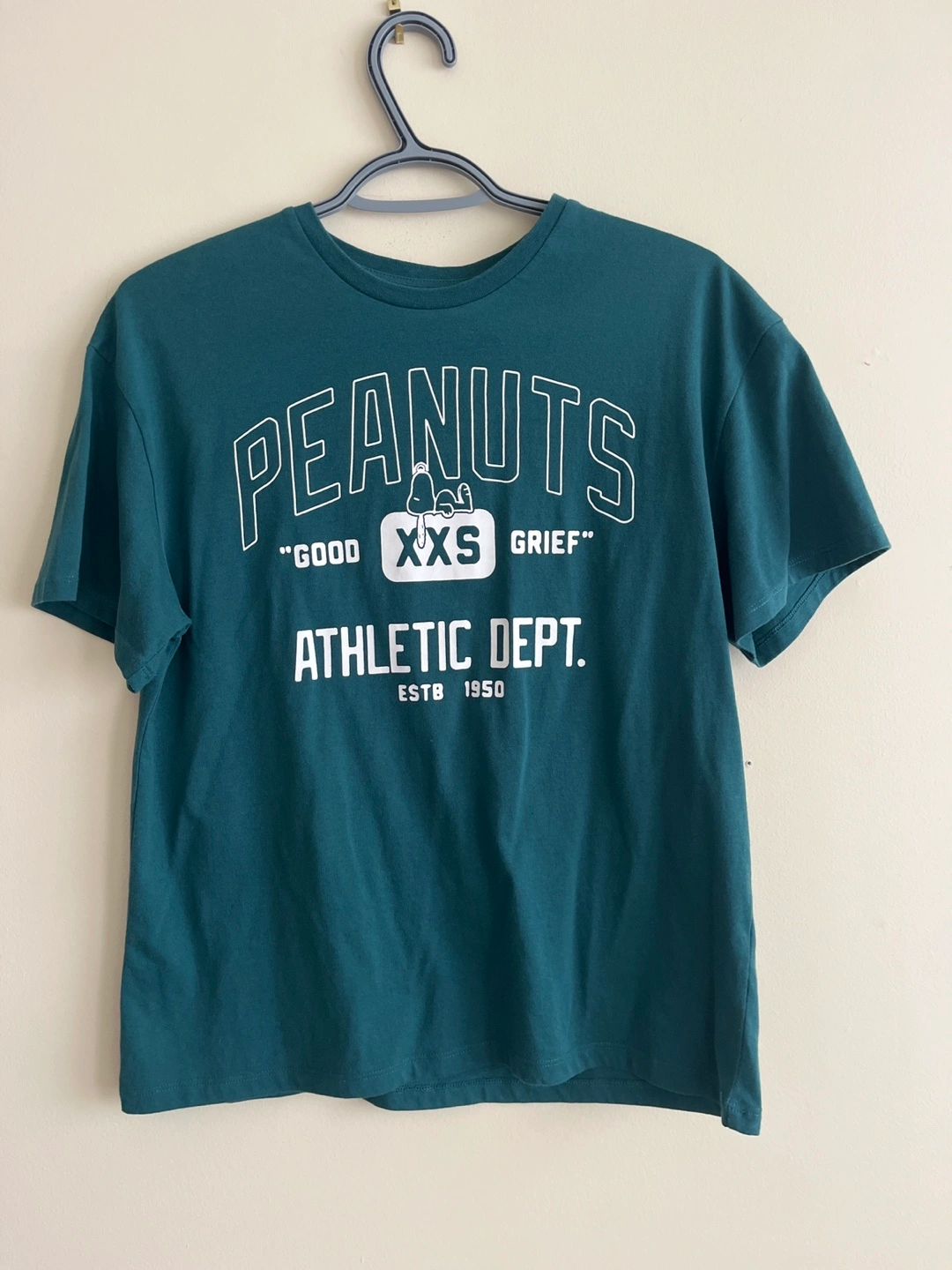 Cute teal Peanuts t-shirt. Features Snoopy graphic on the back and Peanuts Athletic Department logo on the front.
