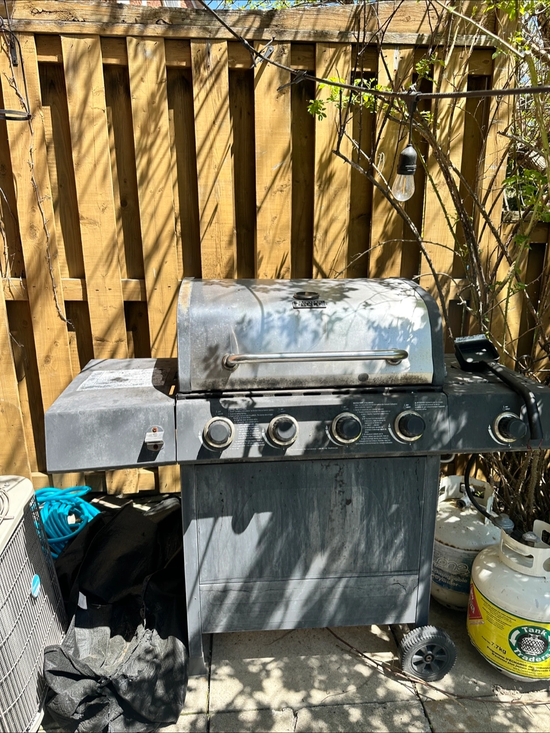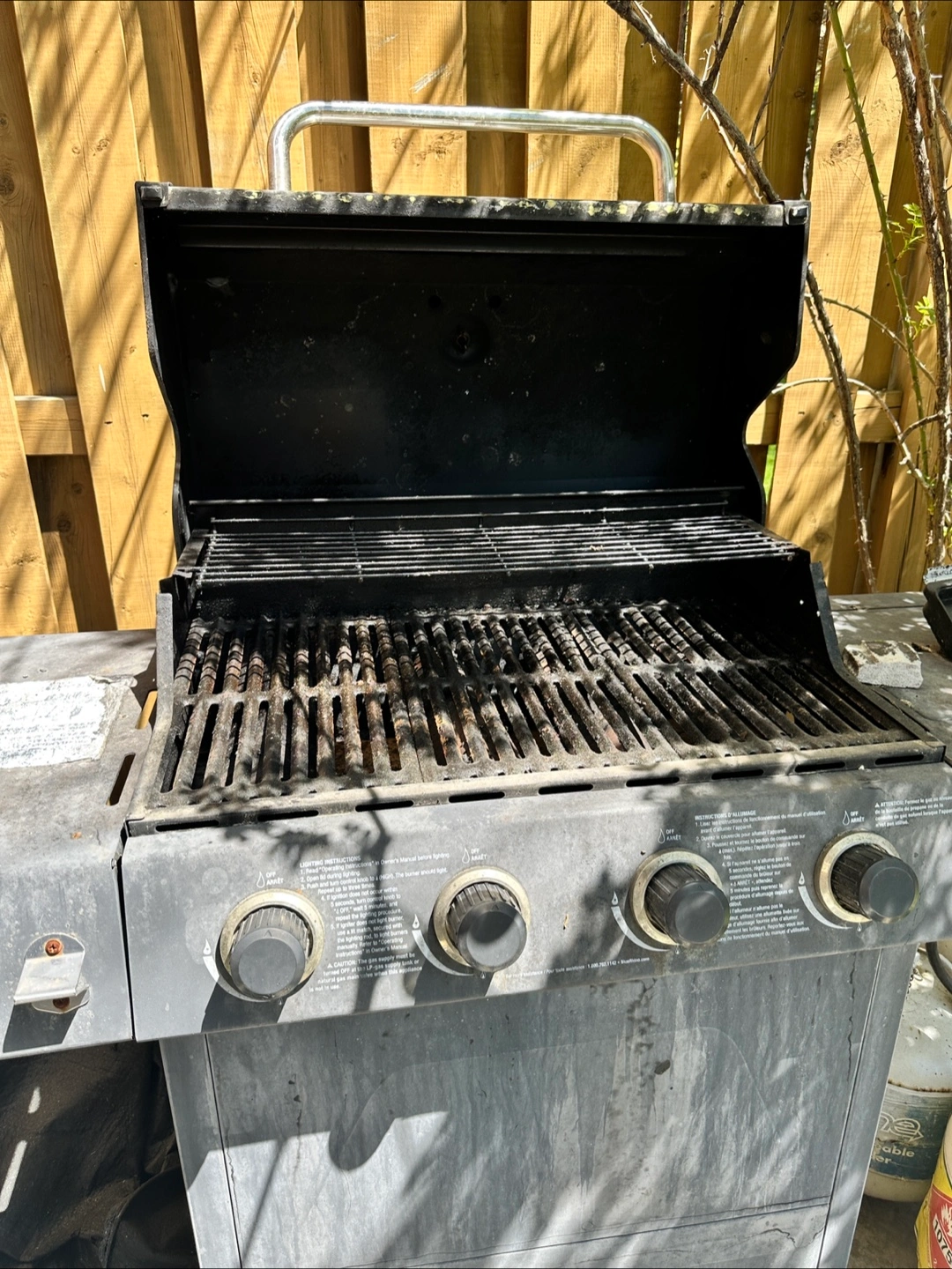Four-burner propane barbecue. Shows some wear from outdoor use. Grilling surface shows signs of use. Needs a good cleaning. Sold as is.