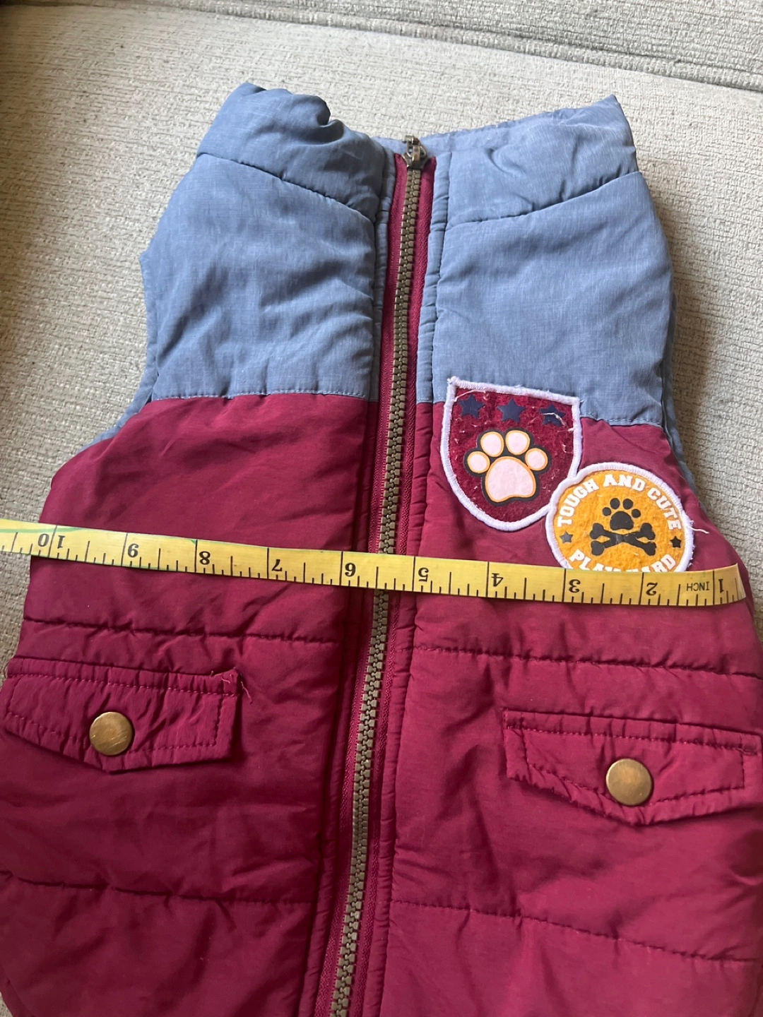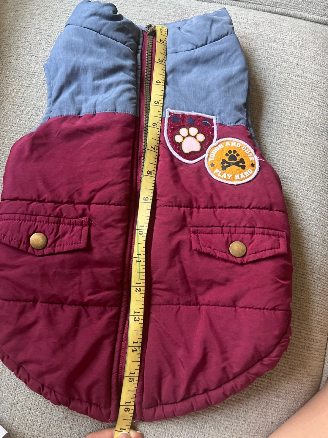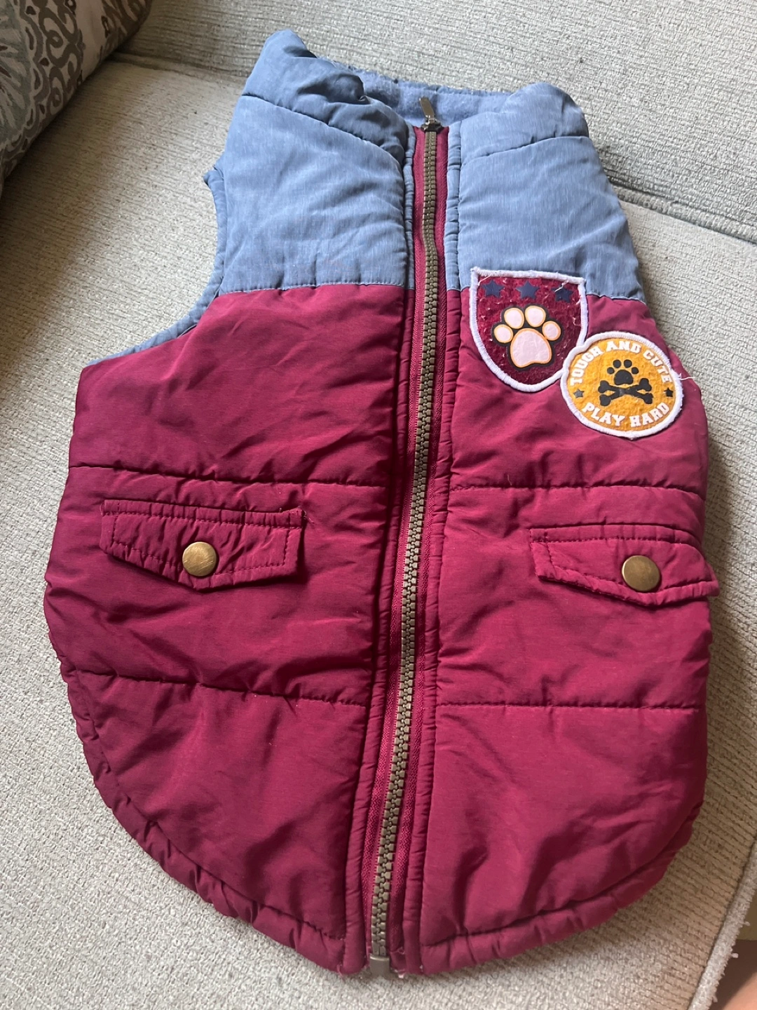 1000+Adorable dog vest. Maroon and gray. Zipper closure. Two front pockets. Patches on the front. Measures approximately 16 inches long and 10 inches wide.