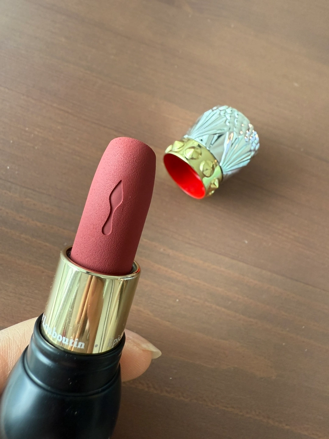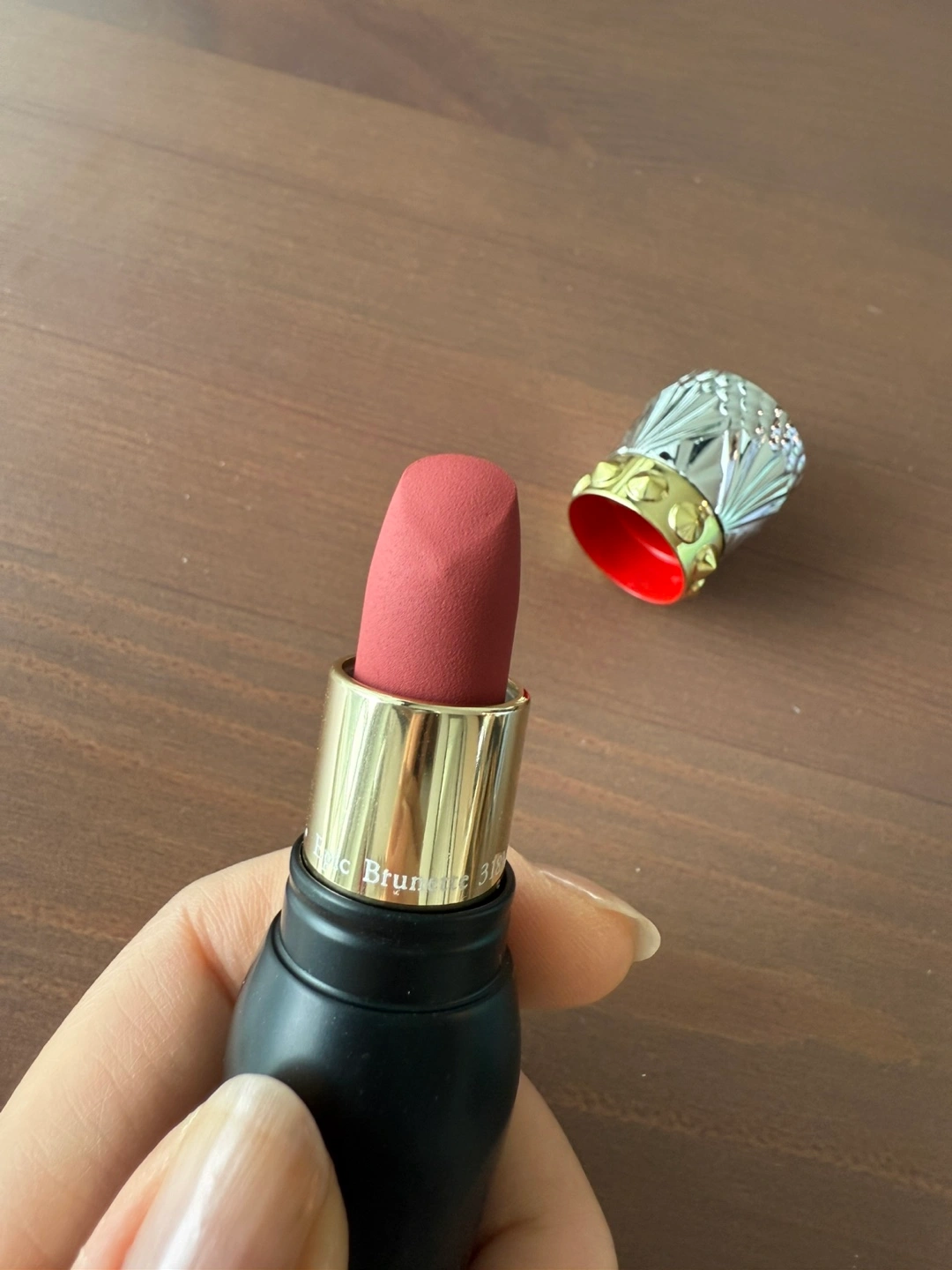 Christian Louboutin lipstick. Velvet matte finish. Shade Epic Brunette 318M. Unique bullet and cap design. Black and silver packaging.