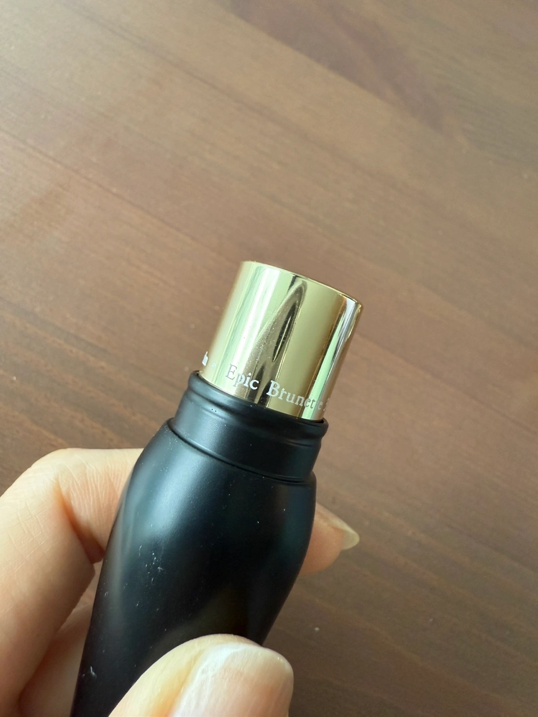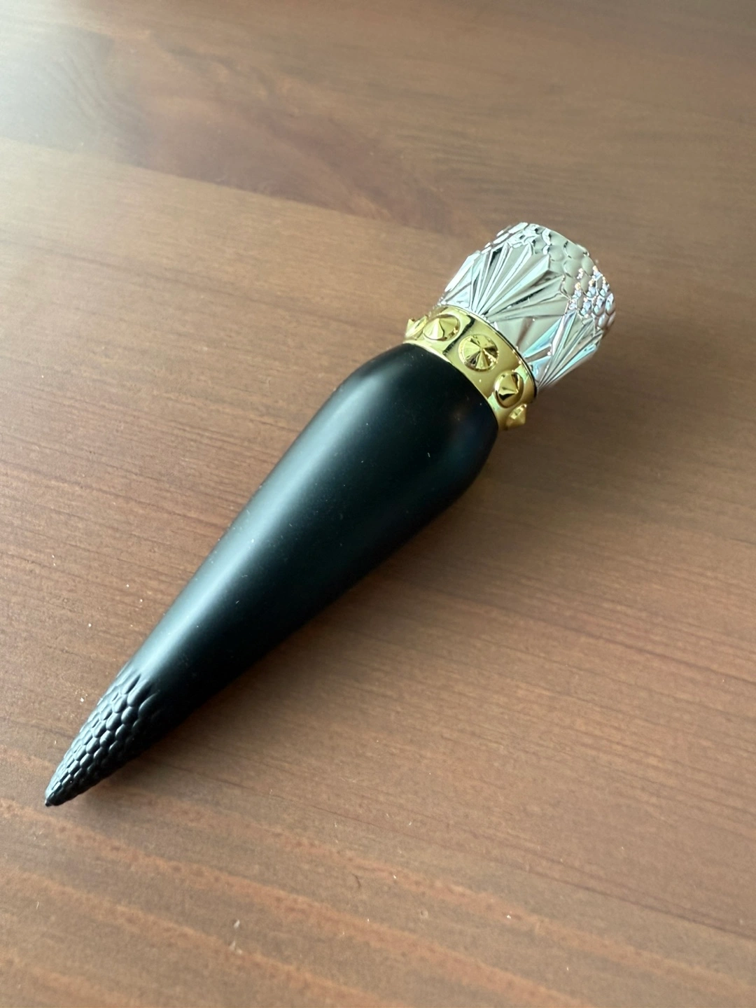 Christian Louboutin lipstick. Velvet matte finish. Shade Epic Brunette 318M. Unique bullet and cap design. Black and silver packaging.