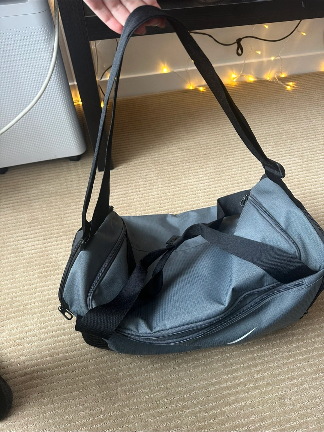 Features a main compartment, smaller interior pocket, and adjustable shoulder strap. Also has 2 side pockets, one smaller and one larger for storing shoes!