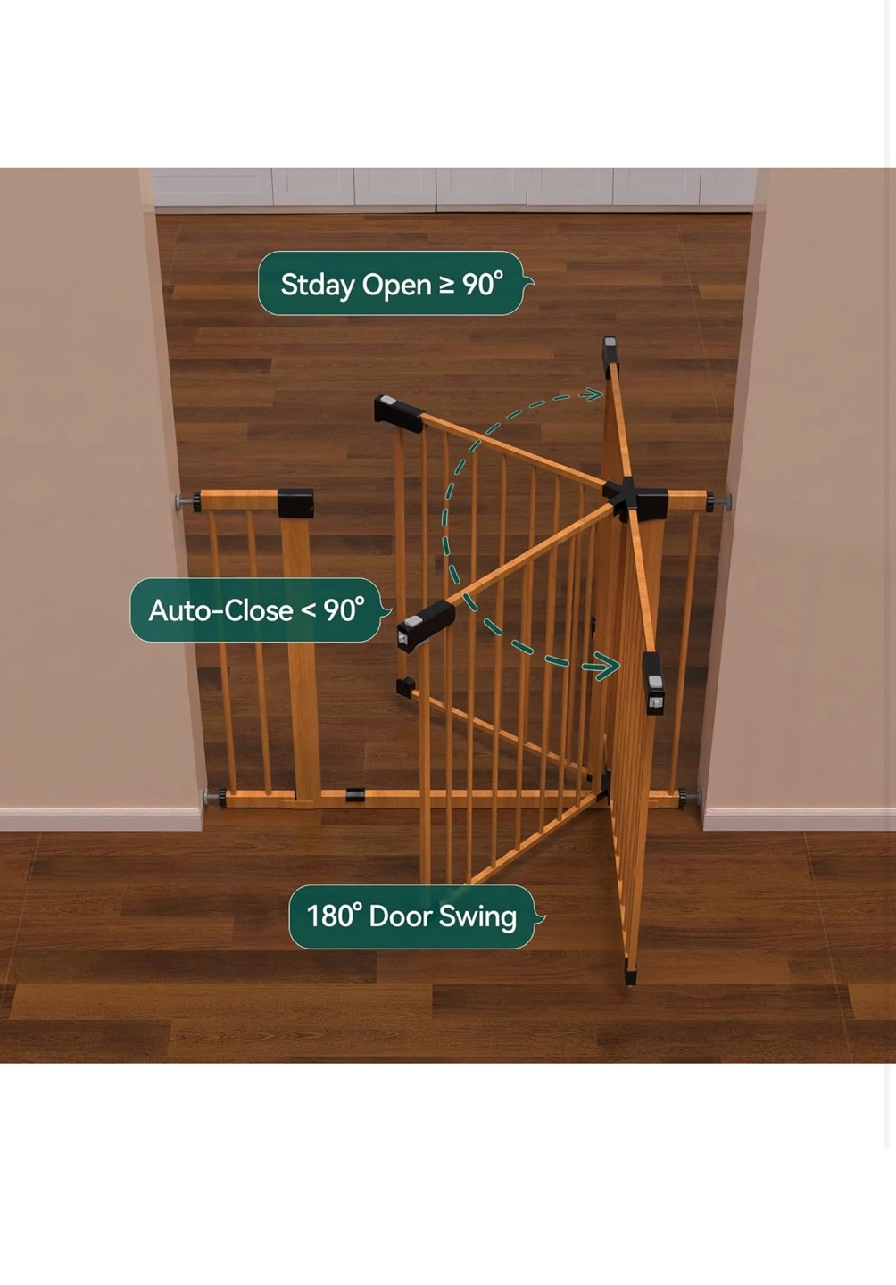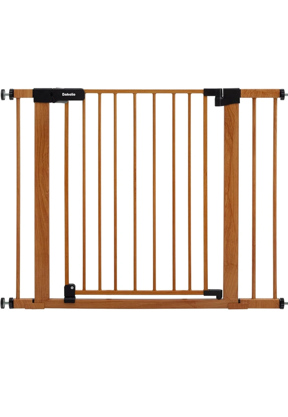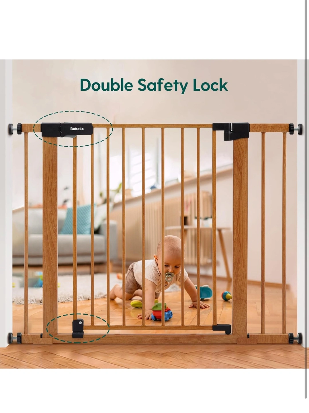 Child safety gate, wood design, metal construction. Double safety lock. Suitable for doorways and stairways. Easy installation. Auto-close function.