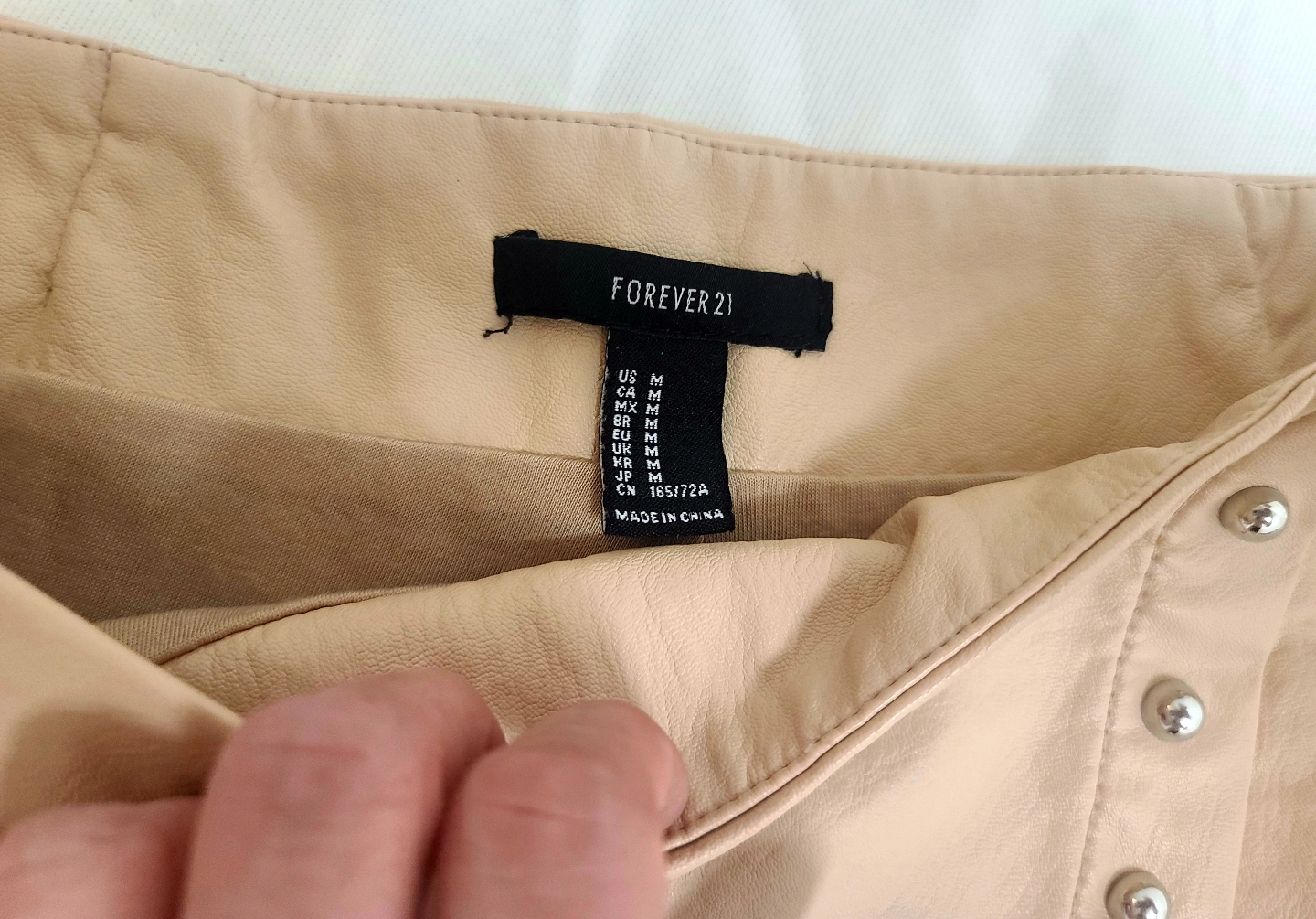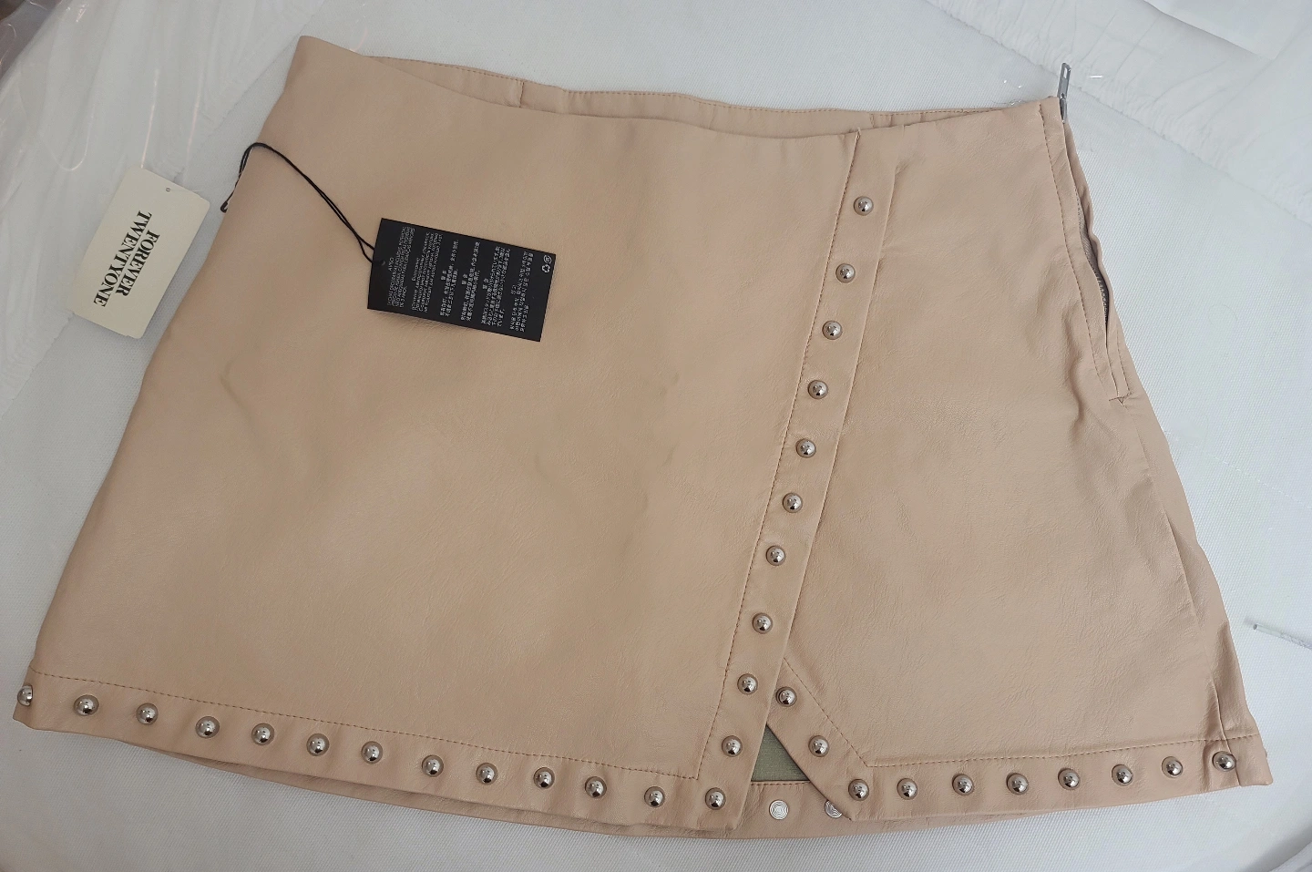 210Brand New Cute beige mini skirt. Faux leather material. Features silver-toned stud detailing. Size medium. Excellent condition.