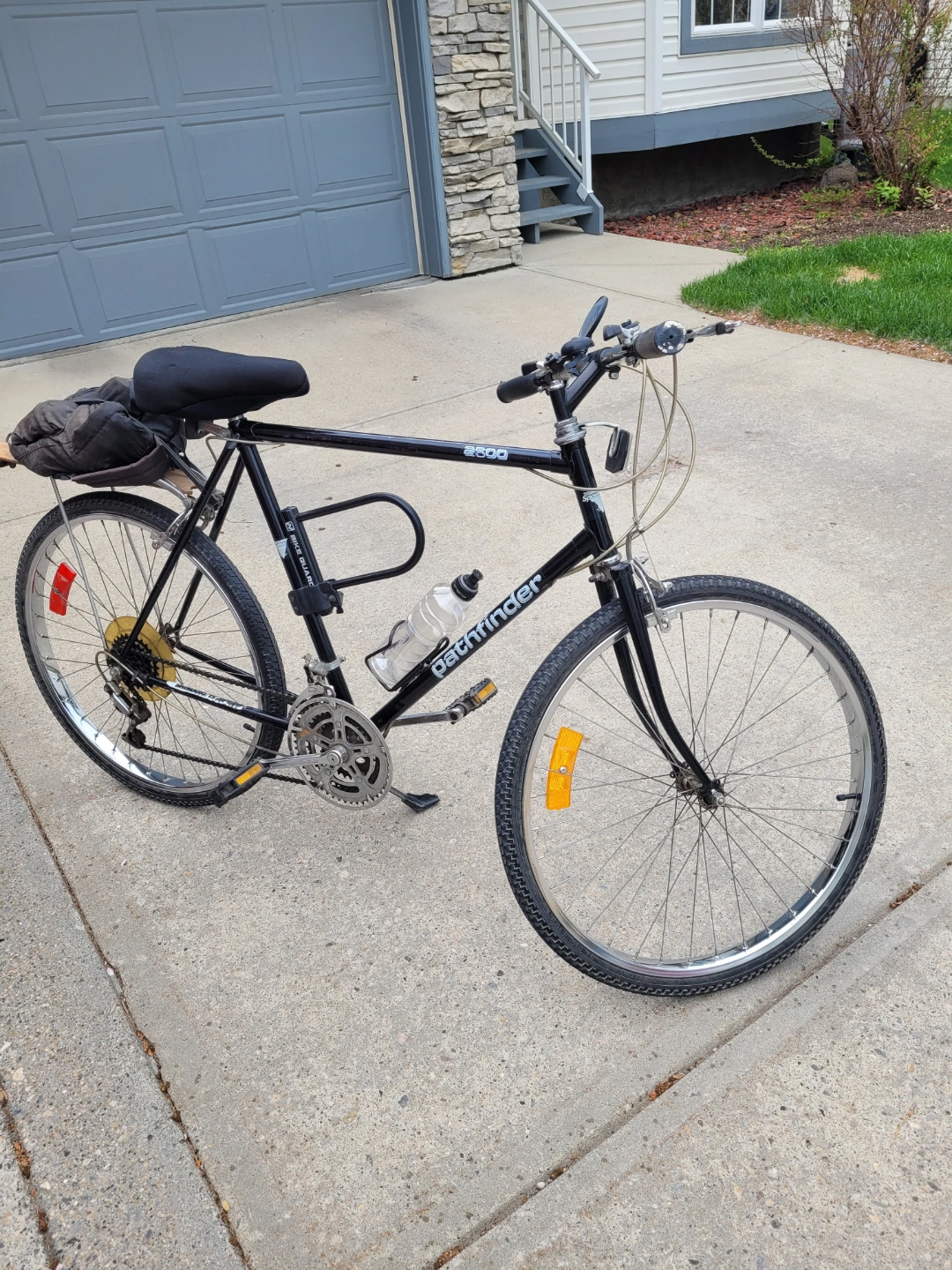 Vintage Pathfinder 2500 bicycle. Black frame. Equipped with a water bottle cage and rear rack. Very good condition.Extra bike accessories included.