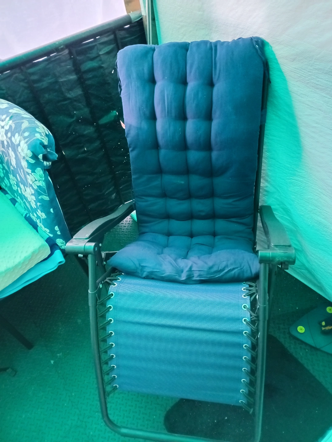 Comfortable folding recliner chair. Durable metal frame. Blue fabric woth blue cushion. Perfect for camping or relaxing outdoors.