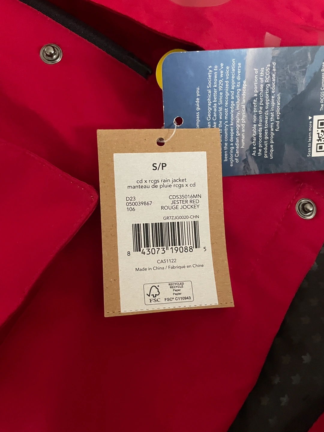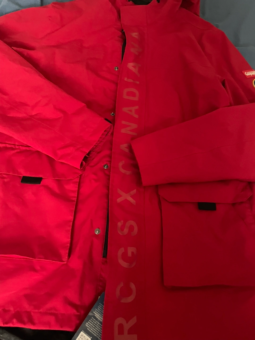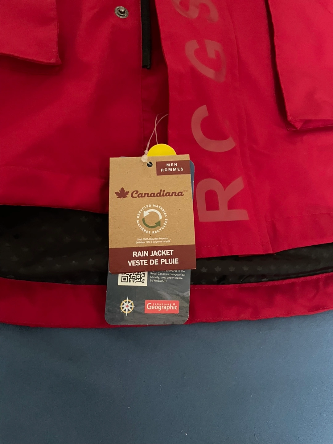 Men's red rain jacket. Features a hood, pockets, and Canadian Geographic branding. Recycled materials. Excellent condition. Two front pockets and a zipper pocket inside.