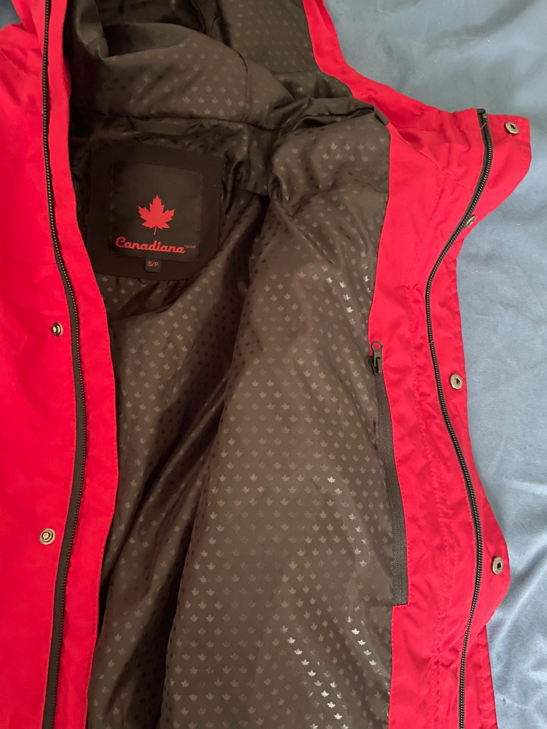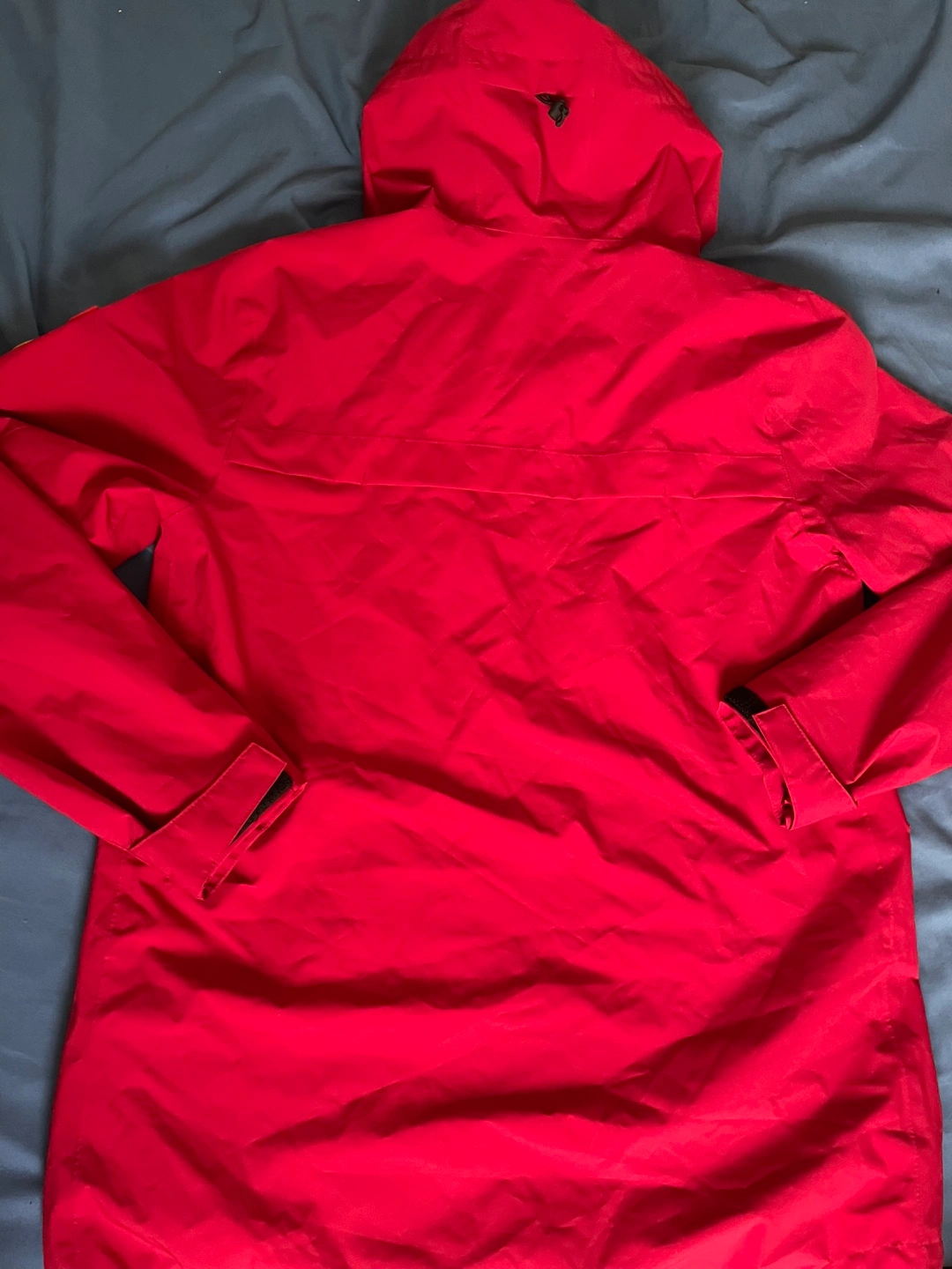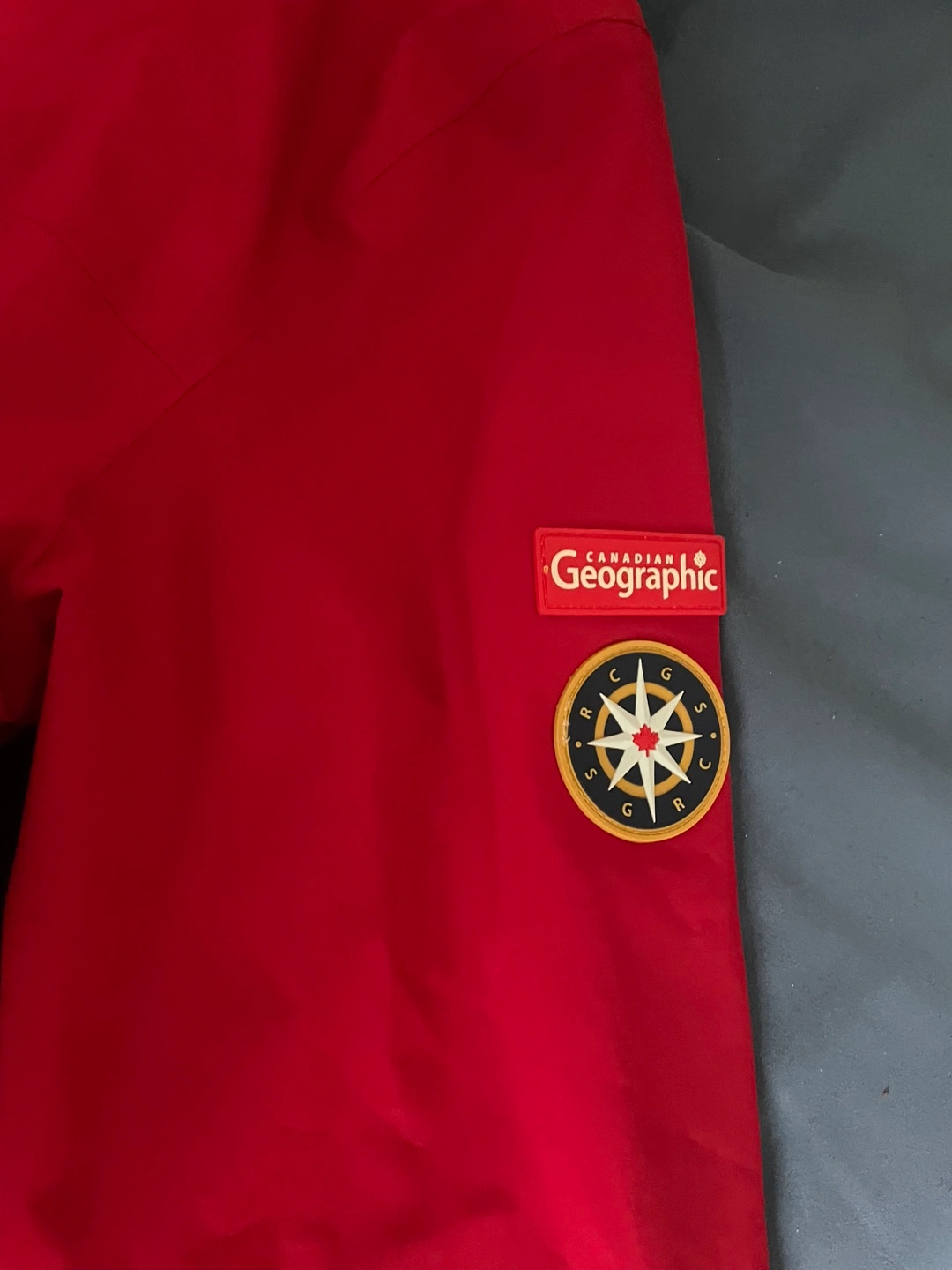 Men's red rain jacket. Features a hood, pockets, and Canadian Geographic branding. Recycled materials. Excellent condition. Two front pockets and a zipper pocket inside.