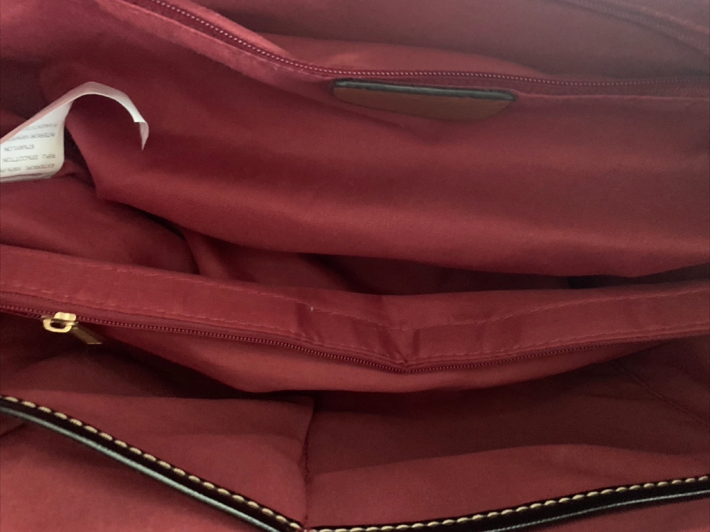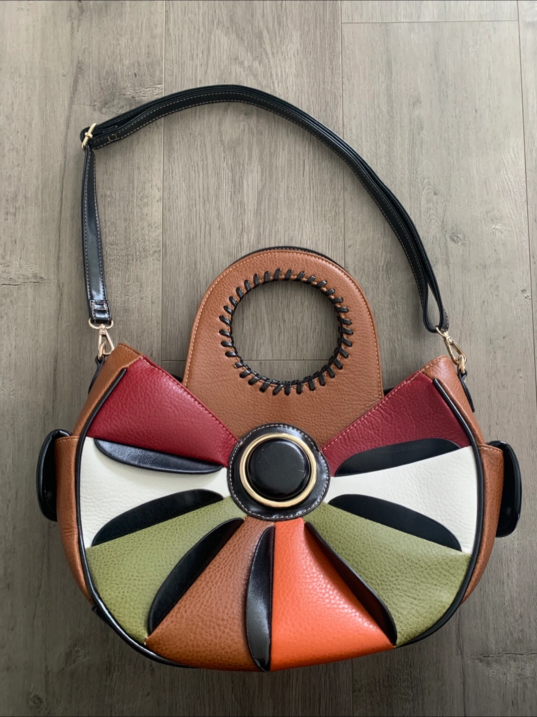 One of a kind handbag. Multicoloured design. Features a top handle and detachable shoulder strap. Exterior pockets. Burgundy interior lining with zippers and extra pockets.