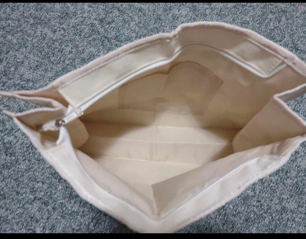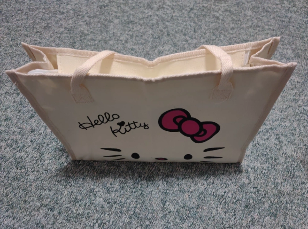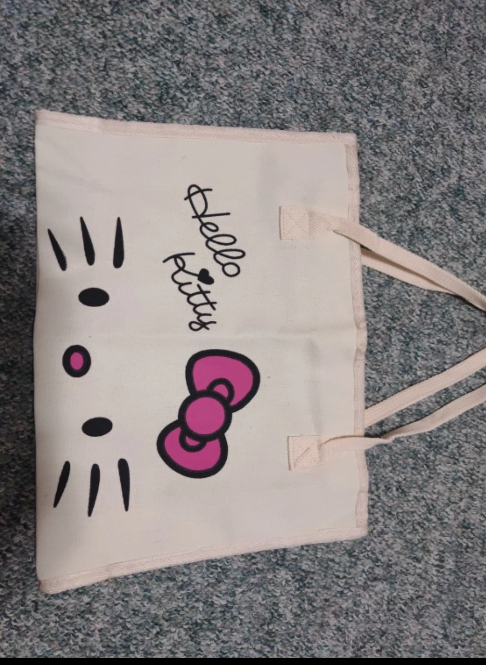 Adorable Hello Kitty tote bag. Features a cream coloured canvas exterior. Inside features multiple pockets and a zipper closure. Perfect for shopping or everyday use.