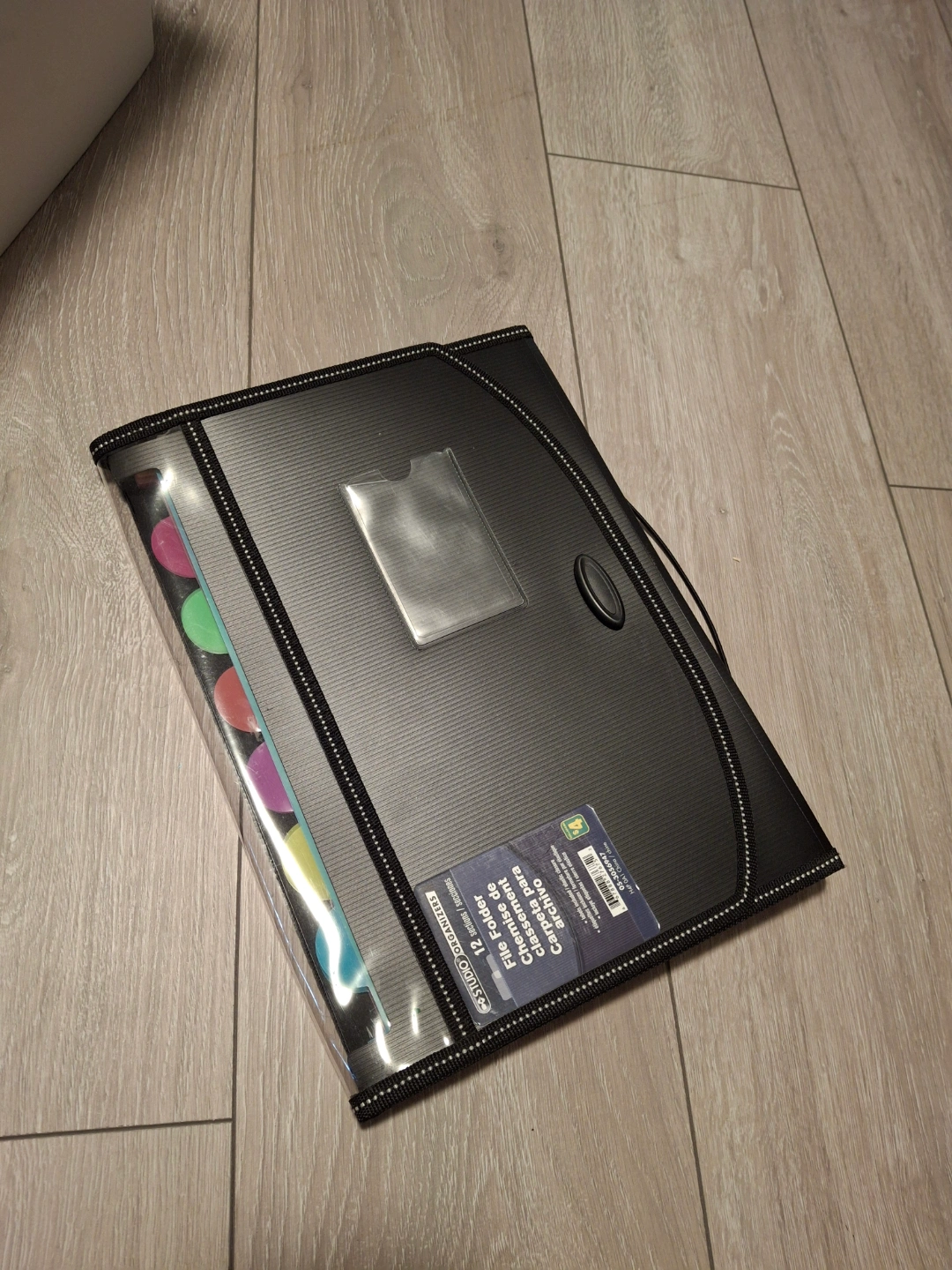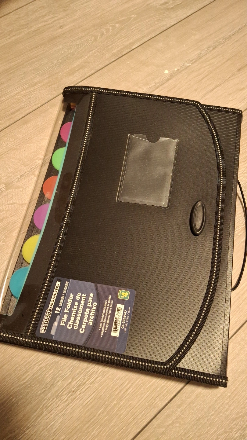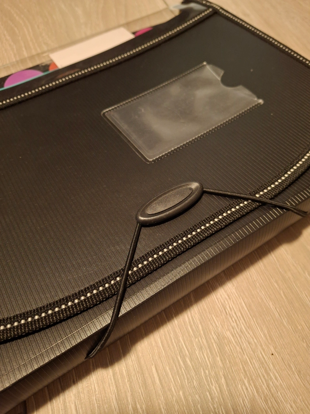 28Black expanding file folder. Twelve colour-coded pockets. Clear ID window. Closeable with a plastic clasp and fabric tie.