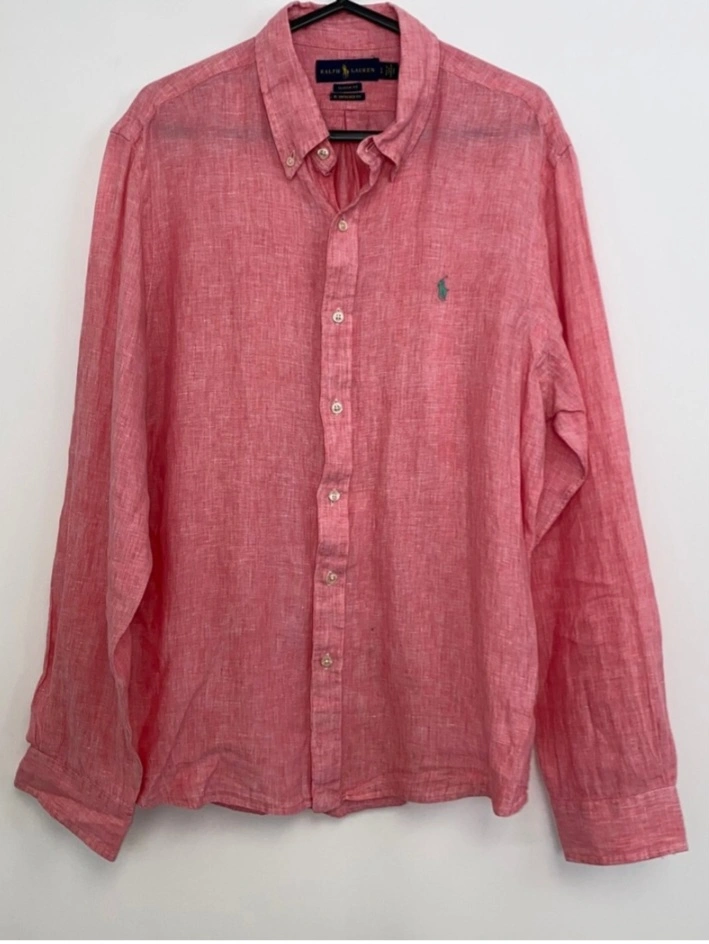 Long sleeve button-up shirt. Pink linen. Classic fit.