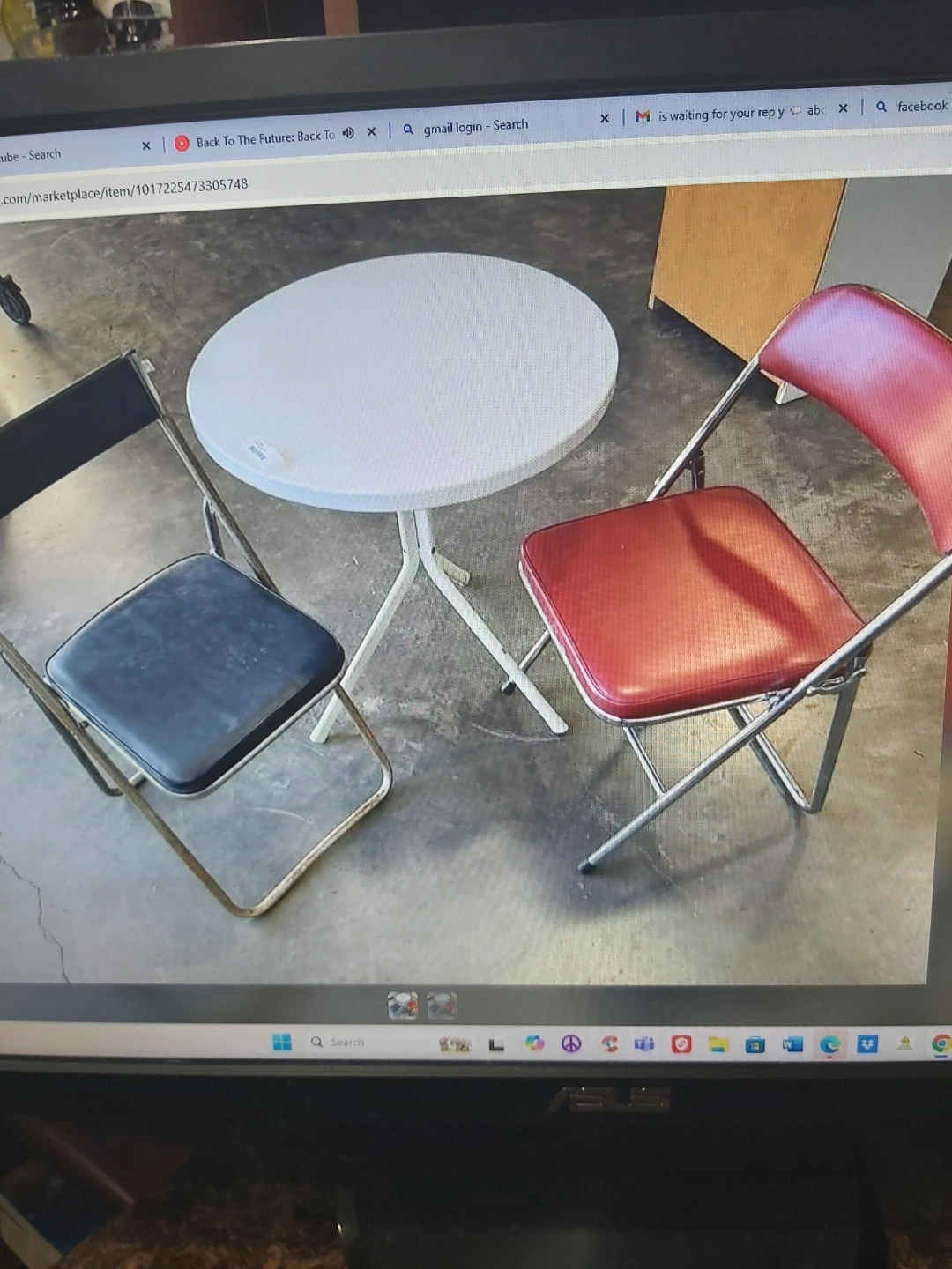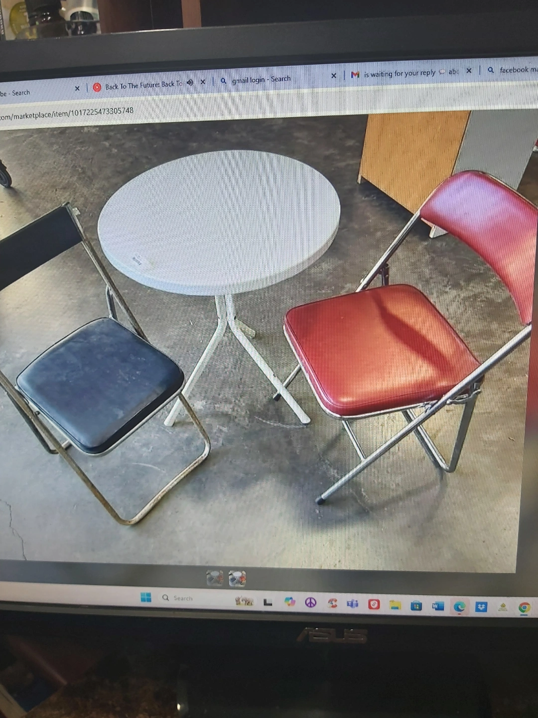 Small folding table with two folding chairs. One chair dark blue, other red. Metal frame. Good for small spaces or patios.