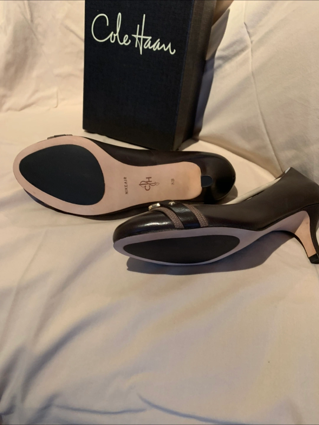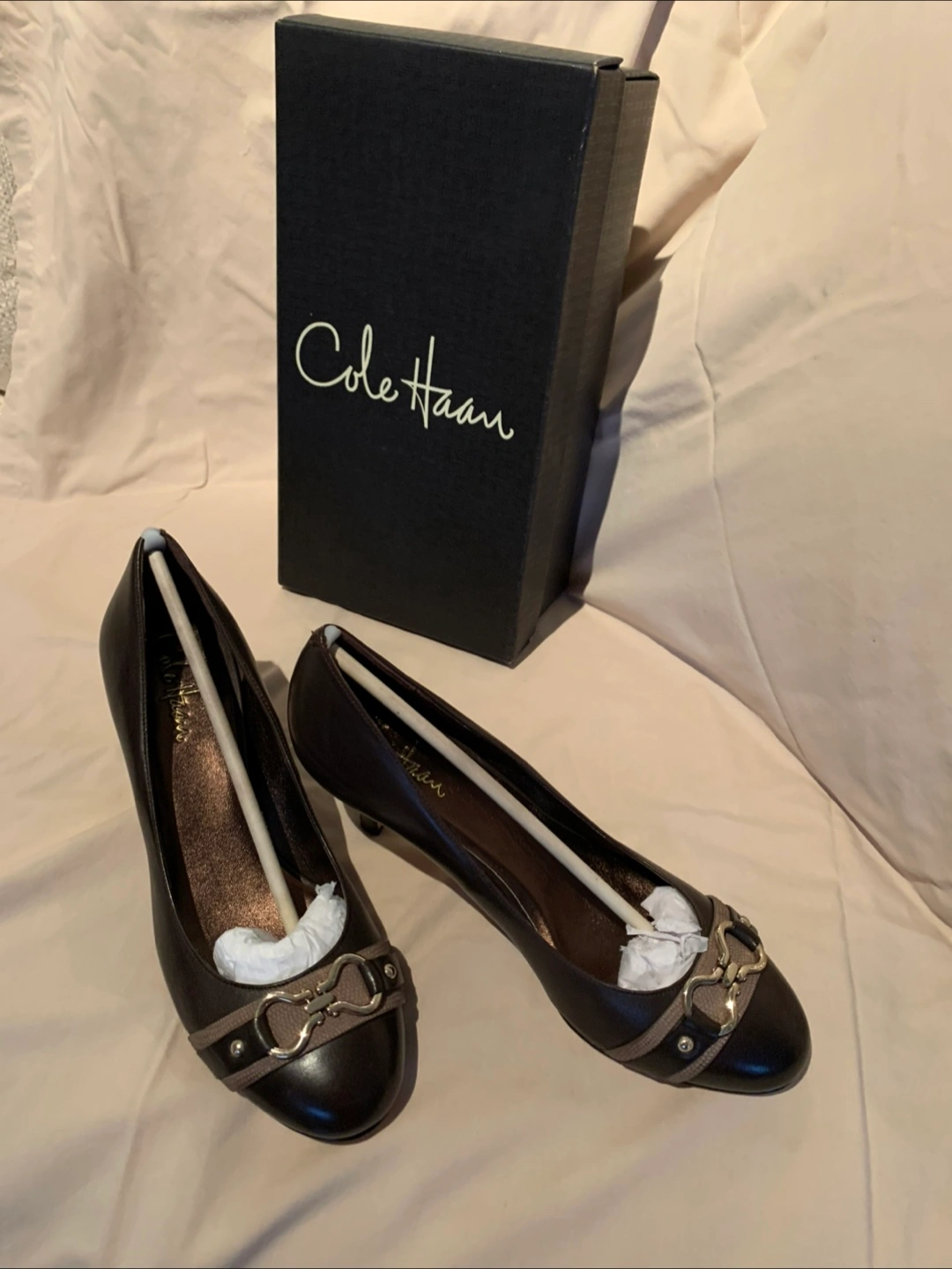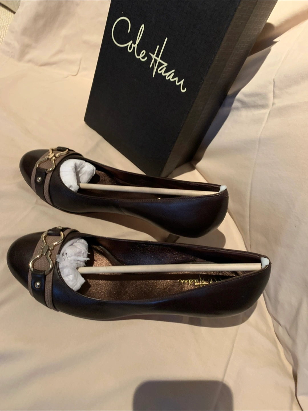 21Brown leather Cole Haan heels. Low heel. Slight embellishment at the toe. Comes in original box.