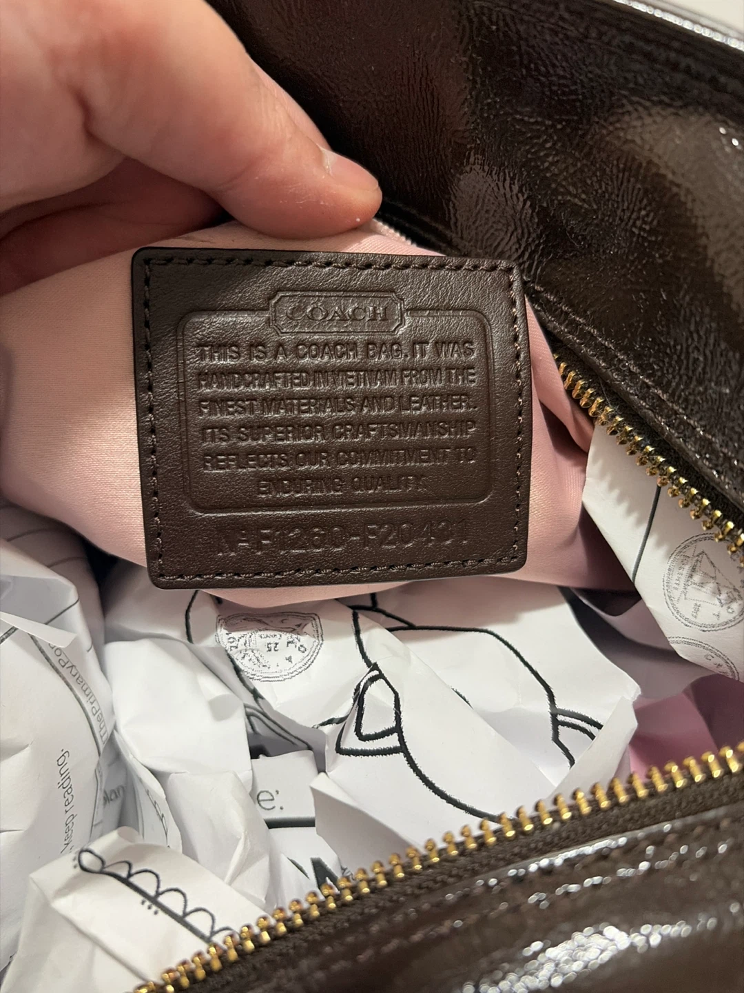 Shiny brown leather Coach tote bag. It has a zippered top closure and gold-tone hardware. Interior lining is a soft pink.
