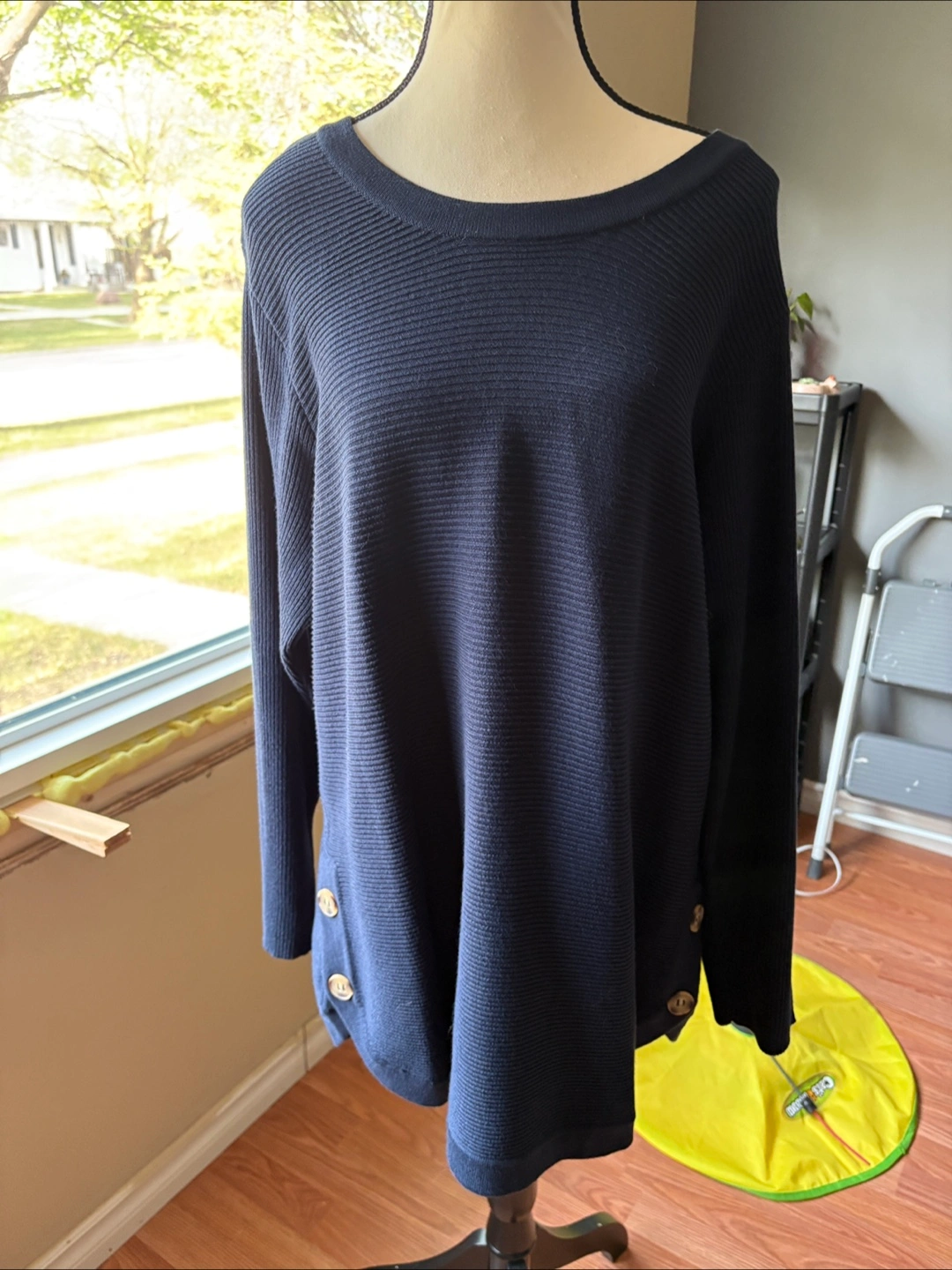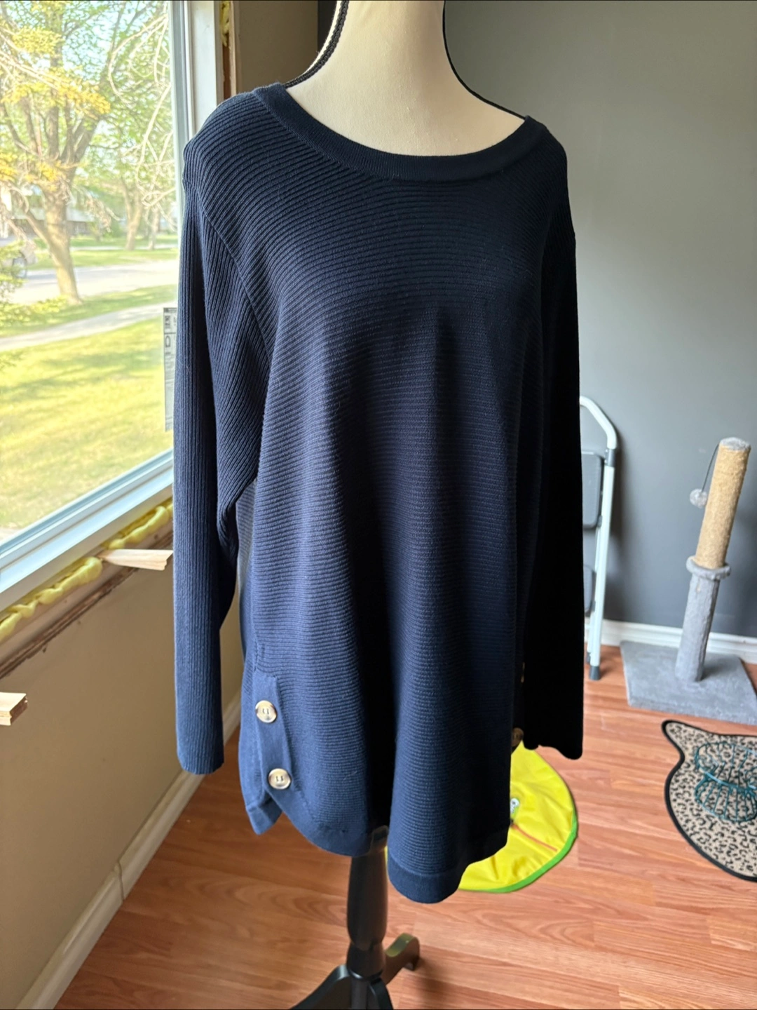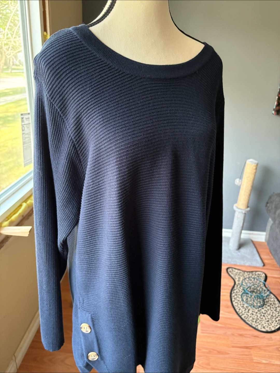Long sleeve, ribbed knit sweater. Navy blue colour. Features side buttons. Relaxed fit. Brand New. Size XL