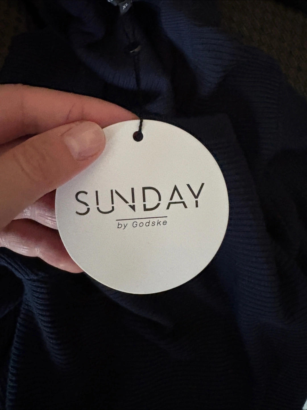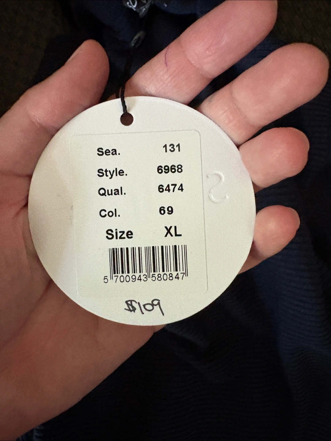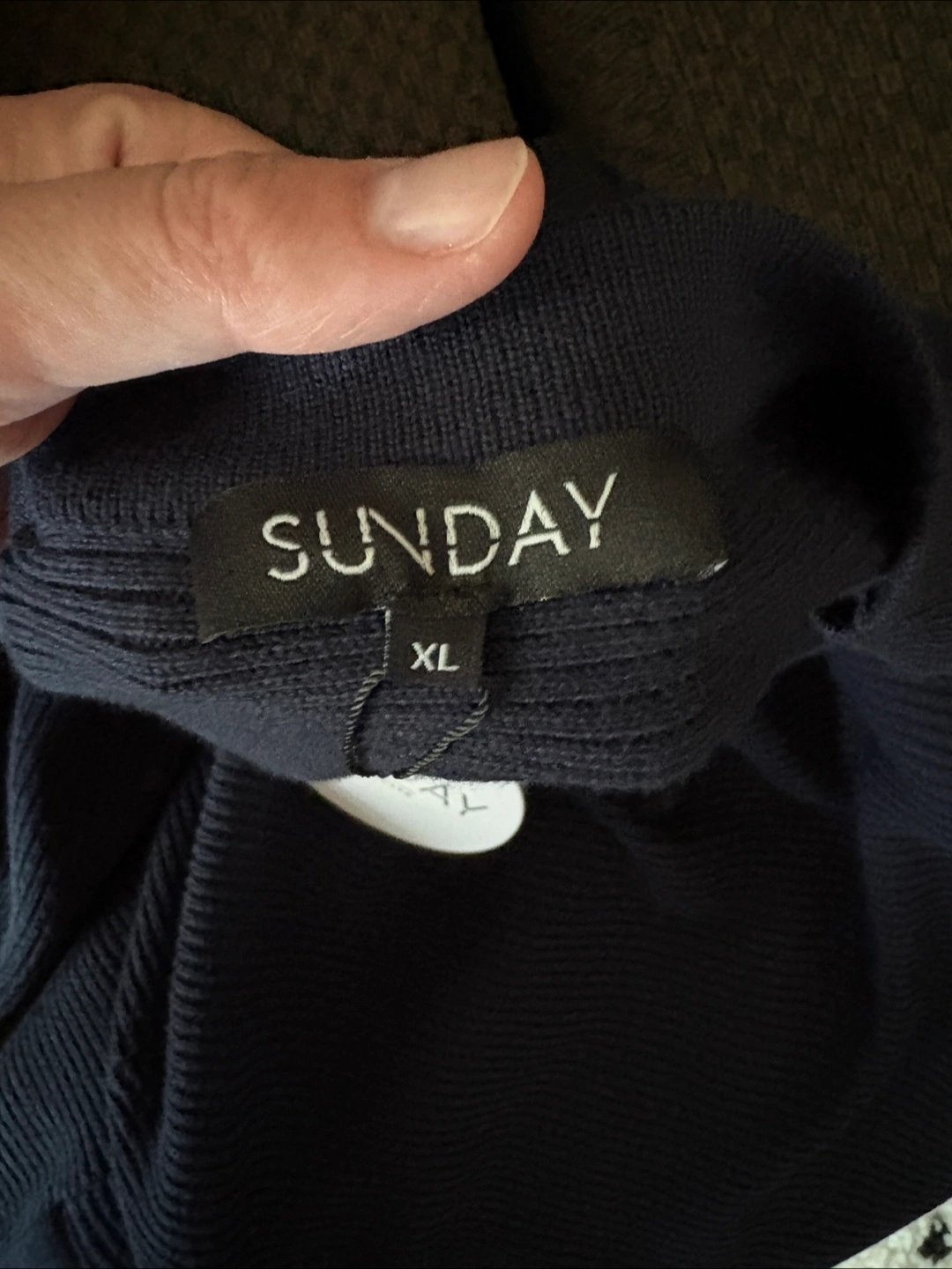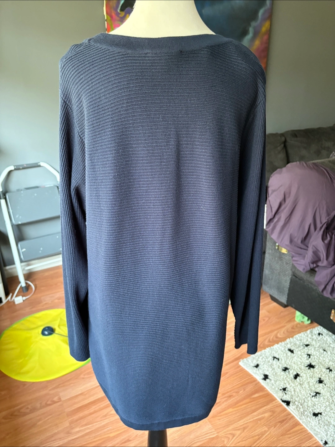 Long sleeve, ribbed knit sweater. Navy blue colour. Features side buttons. Relaxed fit. Brand New. Size XL